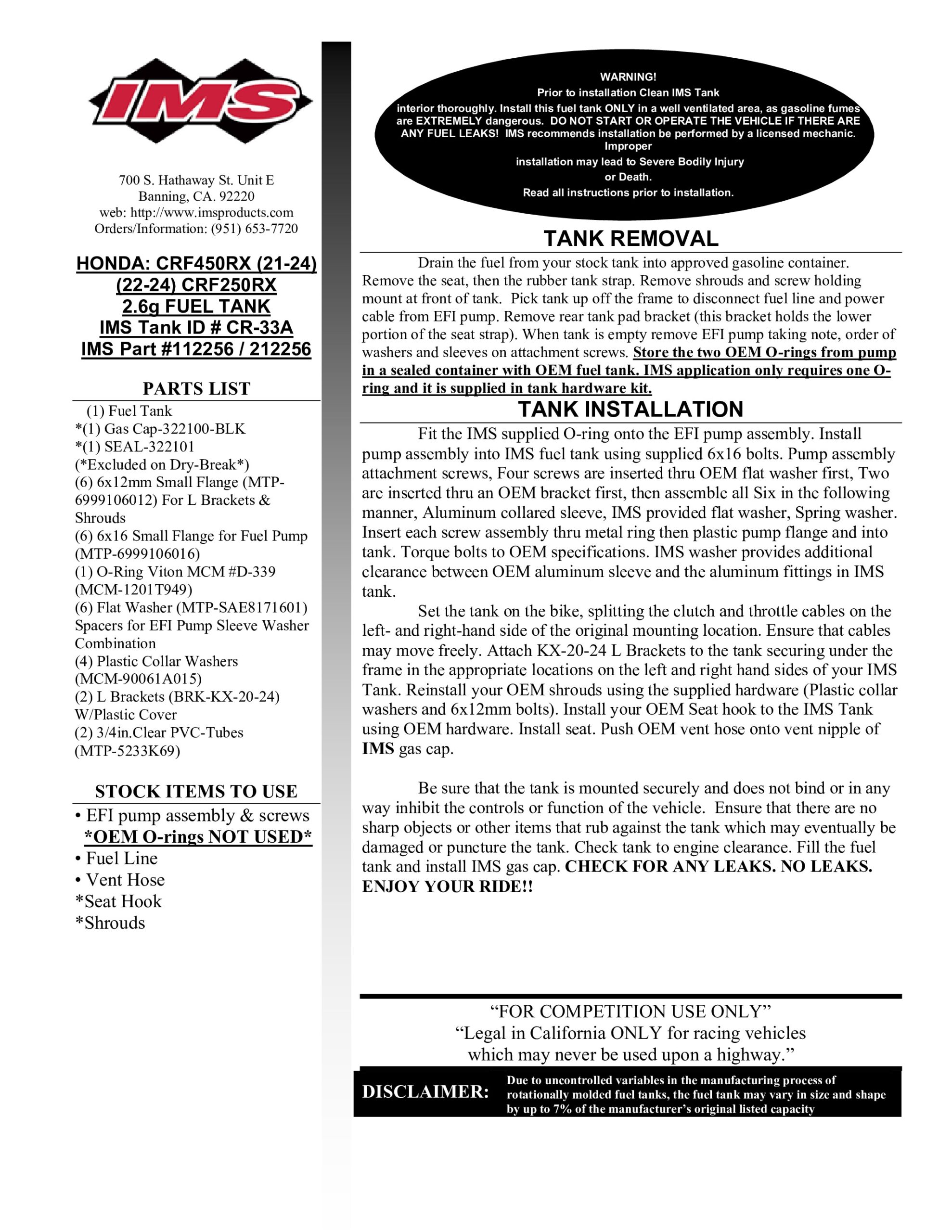 Black Fuel Tank For 22-25 CRF250RX & 21-25 CRF450RX
