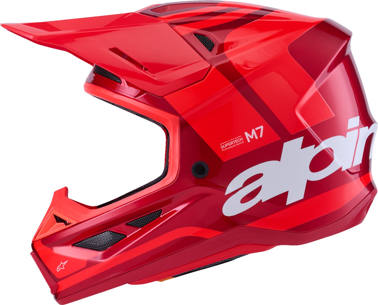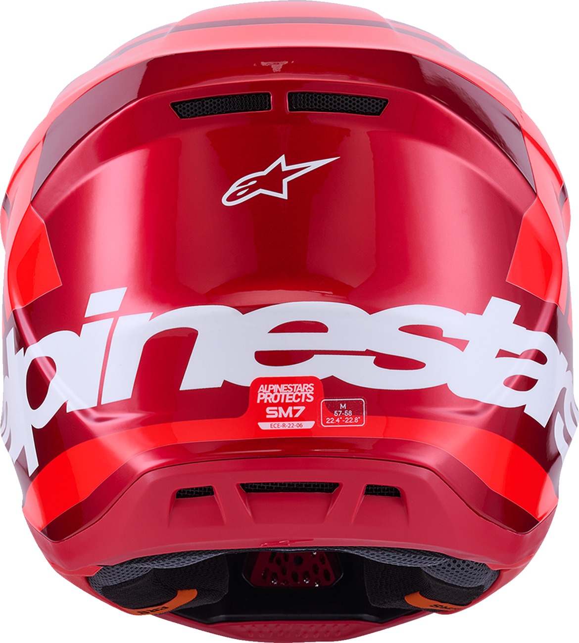 The Alpinestars SM7 Core Helmet is engineered for off-road racing and delivers superior protection, comfort, and ventilation. Its aerodynamic composite shell is designed to reduce friction on impact while efficiently dissipating energy through integrated PLASMA™ technology at the collarbone area. The helmet features an A-Head fitment system, visor detaching mechanism, and 20 intake/exhaust ports for optimum airflow.