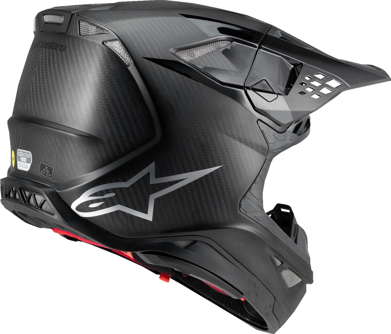 The Alpinestars Supertech M10 Fame MIPS Helmet in Black Carbon (Medium) delivers top-tier protection and comfort for motocross riders. Designed with a smooth, aerodynamic profile, the S-M10 reduces friction on impact and improves energy deflection to safeguard your head and neck. The carbon composite shell is lightweight and utilizes a multi-composite combination for strength. This helmet features the Multi-Directional Impact Protection System (MIPS®) for advanced rotational impact mitigation, plus an Emergency Release System (ERS) for quick cheek pad removal. The A-Head fitment system enables precise angle and height adjustment. With 28 ventilation ports, the S-M10 is ultra-ventilated, and it includes ECE R 22.06 and DOT certifications for safety. Additional highlights: removable cheek pads, hydration system compatibility, collarbone protection zones, patented visor release, and included spare visor and helmet bag.