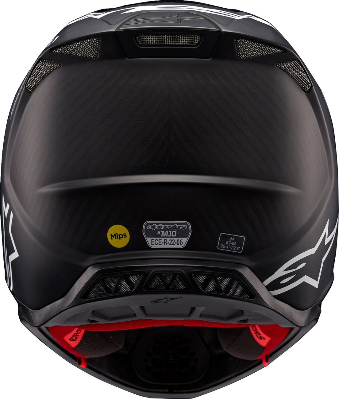 The Alpinestars Supertech M10 Flood MIPS Helmet delivers advanced protection and comfort for offroad riders. Its aerodynamic carbon/aramid composite shell is designed for optimal safety, featuring a smooth profile to minimize load points and promote energy deflection during impacts. The helmet is ECE R 22.06 and DOT certified, with a unique collarbone clearance design and soft EPS liner extensions. The A-Head fitment system allows precise adjustment of fit and helmet angle, while 28 ventilation ports ensure superior airflow. MIPS® technology enhances rotational impact protection. Additional features include a patented visor release system, emergency release cheek pads, removable side pads, and hydration system compatibility. Comes with a spare visor and helmet bag. Color: Black/Dark Gray, Size: Medium.