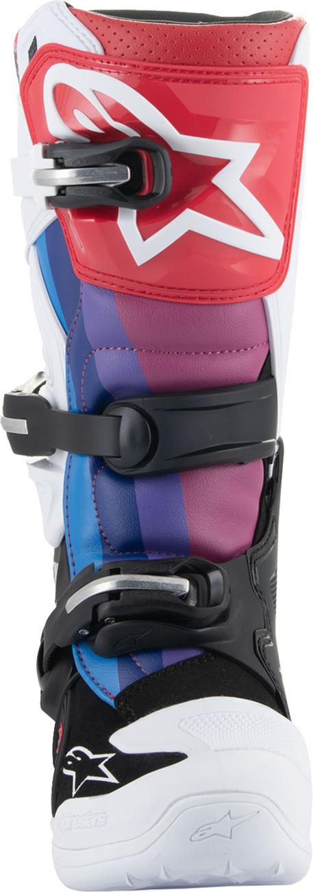 The Alpinestars Youth Tech 7S Boots in White/Black/Rainbow are specifically designed and sized for junior and smaller framed riders. Featuring a PU-reinforced microfiber upper for flexibility, abrasion resistance, water resistance, and weight saving, these boots offer a consistent fit that is easy to maintain and clean. The contoured shin plate is injected with high-modulus Thermoplastic Polyurethane (TPU) for excellent impact and abrasion resistance. The medial side incorporates a TPU panel for maximum bike grip and improved heat and abrasion resistance. A one-piece injected dual compound foot shell with hard toe protector and integrated steel shank enhances durability and protection. The boots provide excellent flexion via a low-profile medial and lateral pivot system for movement and support, with instep and Achilles accordion flex zones for superior control. An extended microfiber gaiter helps seal out water and dirt. The compound sole is seamlessly integrated for durability, grip, and feel and is also replaceable. Comfort is ensured by soft poly foam reinforcement at the ankle and collar, a removable anatomic footbed, and a 3D mesh textile with open cell foam for air circulation. The buckle closure system features polymer and fiberglass arms with high-impact aluminum bridge closures for durability and weight saving, plus a memory and quick release/locking system for easy, precise closure. All buckles are easily replaceable. The Tech 7S boot is CE certified to EN 13634:2010.