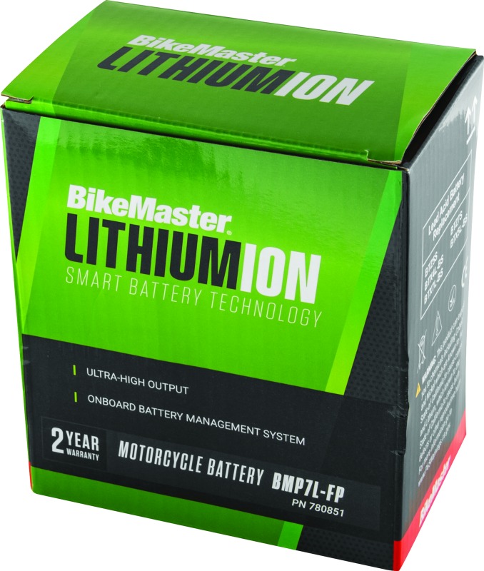 Upgrade your ride with the BikeMaster® Lithium Ion 2.0 Battery – BMP7L-FP. Featuring the most advanced Lithium-Iron Phosphate battery technology, this battery delivers ultra-high cranking amps and twice the service life of traditional lead-acid batteries. At just a third of the weight of a conventional battery, it contains no corrosive liquids or heavy metals, making it a more environmentally friendly choice. Enjoy reliable starts, lighter weight, and peace of mind with a two-year warranty. Dimensions: 107mm L x 56mm W x 85mm H. 130 cold cranking amps.