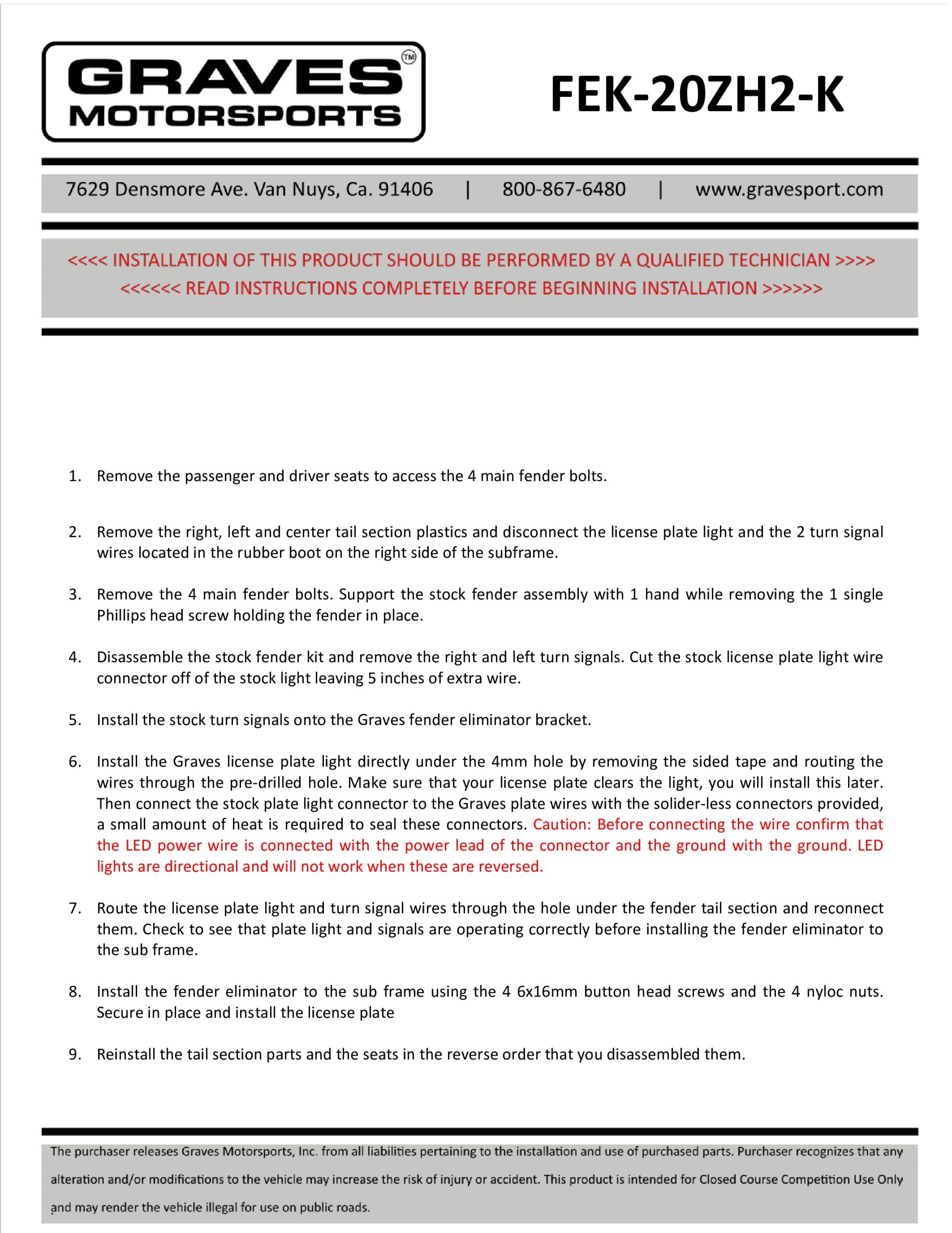 All Graves Motorsports fender eliminator kits are fabricated from black power-coated 5052 aluminum for long term reliability and great looks. There is no cutting required to your stock fender and all hardware is included for easy installation.