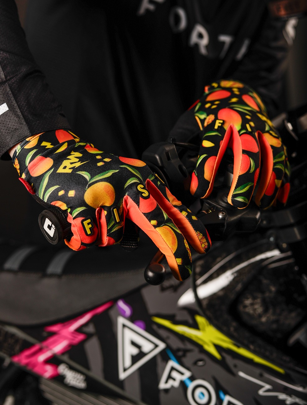 Ride with confidence in the FIST Handwear R-Willy Red Label Mango Madness Gloves. This short-cuff, strap-closure glove is built for BMX, MTB, and MX riders who demand grip, comfort, and control in all conditions.