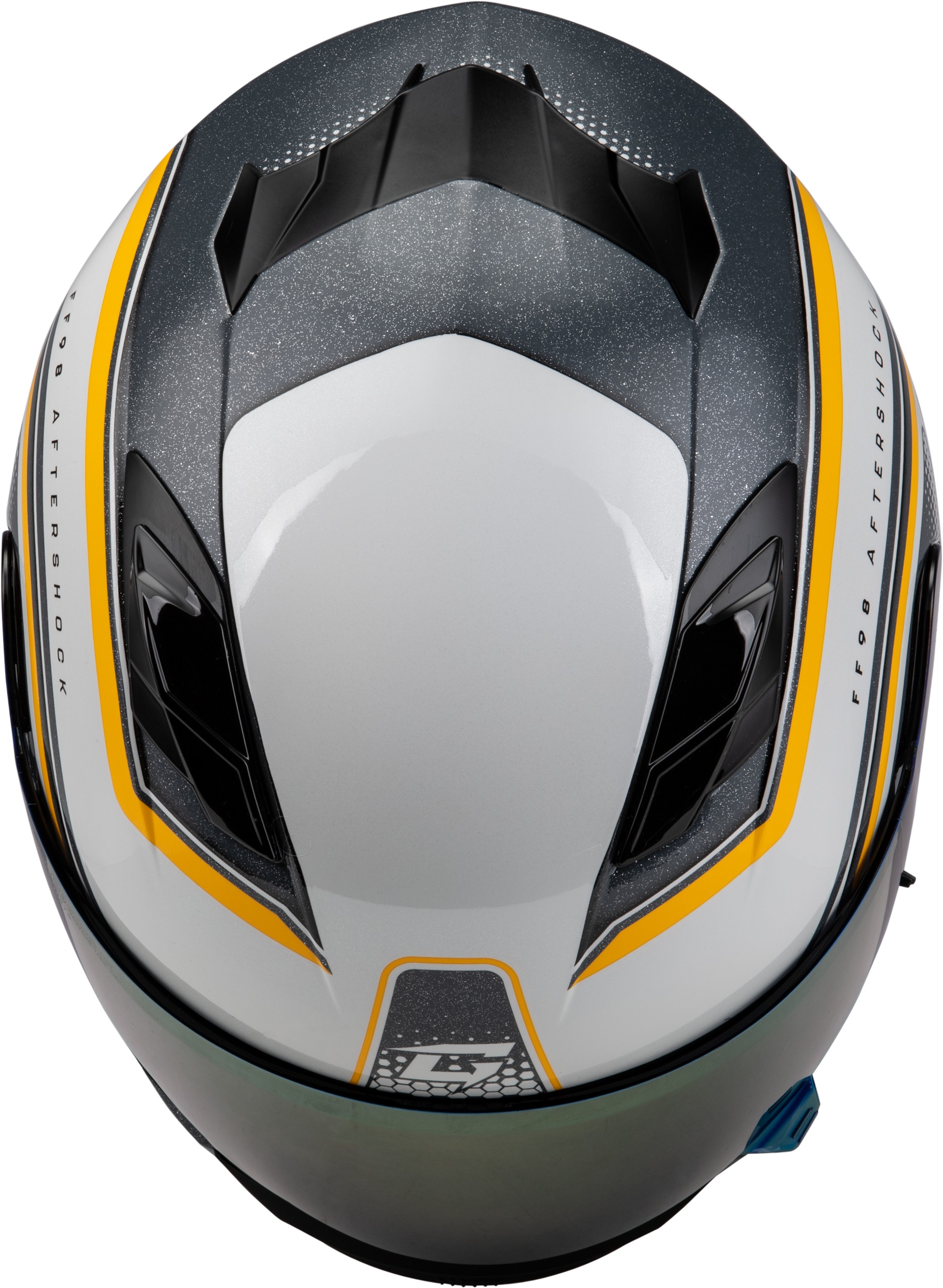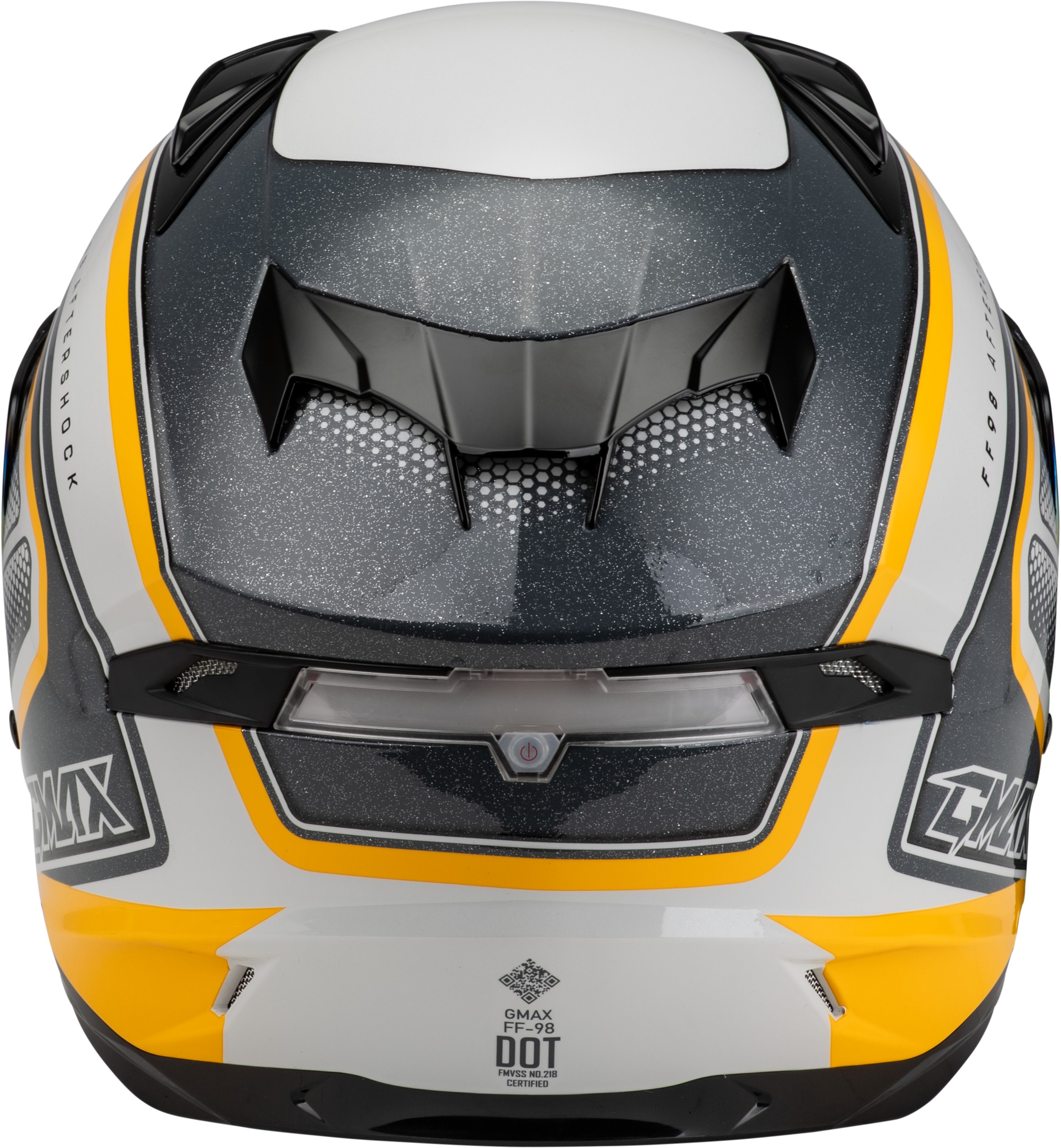 The GMAX FF-98 Aftershock Helmet in White/Metallic Silver (X-Small) delivers advanced protection and comfort for street riders. DOT approved, it features a lightweight Poly Alloy shell and a removable, washable SpaSoft™ interior utilizing COOLMAX CORE technology and charcoal bamboo fiber for moisture-wicking and odor control. The helmet is equipped with a quick release, tool-less face shield mechanism with shield lock, built-in drop-down sun shield with anti-fog coating, and UV400 coated shields for 100% UV protection. Eight intake and exhaust vents ensure optimal airflow. An integrated multi-function red LED rear light is included, with optional upgrade to a wireless brake light kit. Additional features comprise a breath deflector, chin curtain, built-in speaker pockets, and intercom compatibility for enhanced riding convenience.