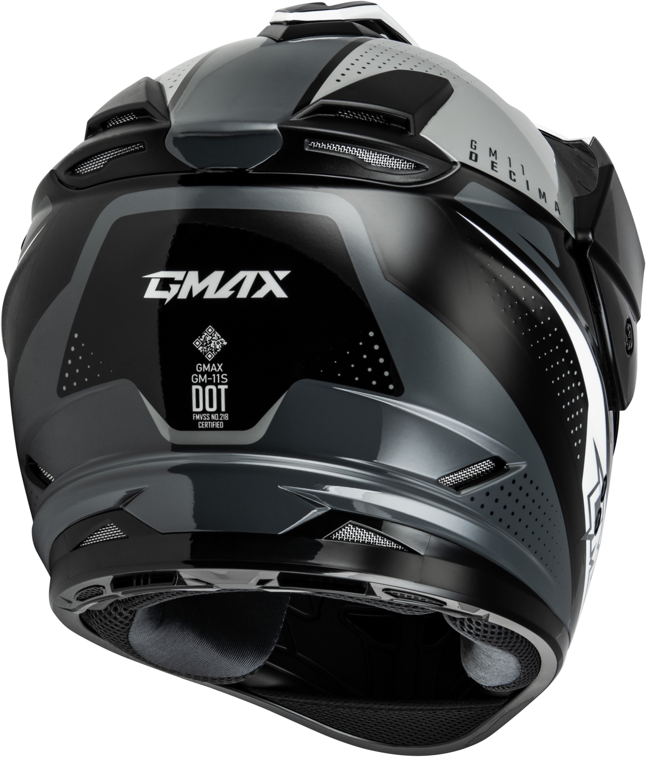 The GMAX GM-11 Decima Dual Sport Helmet in Black/Grey/White (Large) delivers versatile protection for both on- and off-road adventures. DOT approved, this helmet easily converts from a visor to a visor-less setup, with side shield plate covers included for customization. The outer flip shield hides neatly under the visor and out of sight when fully raised. A large eye port accommodates oversized goggles, and the visor is designed for optimal airflow to reduce lift at highway speeds. The shield is operable with goggles, and the plush COOLMAX® interior is removable and washable for comfort and hygiene. Integrated speaker pockets make this helmet intercom compatible. Enjoy 100% UV400 protection. Optional cold weather kit available (sold separately).