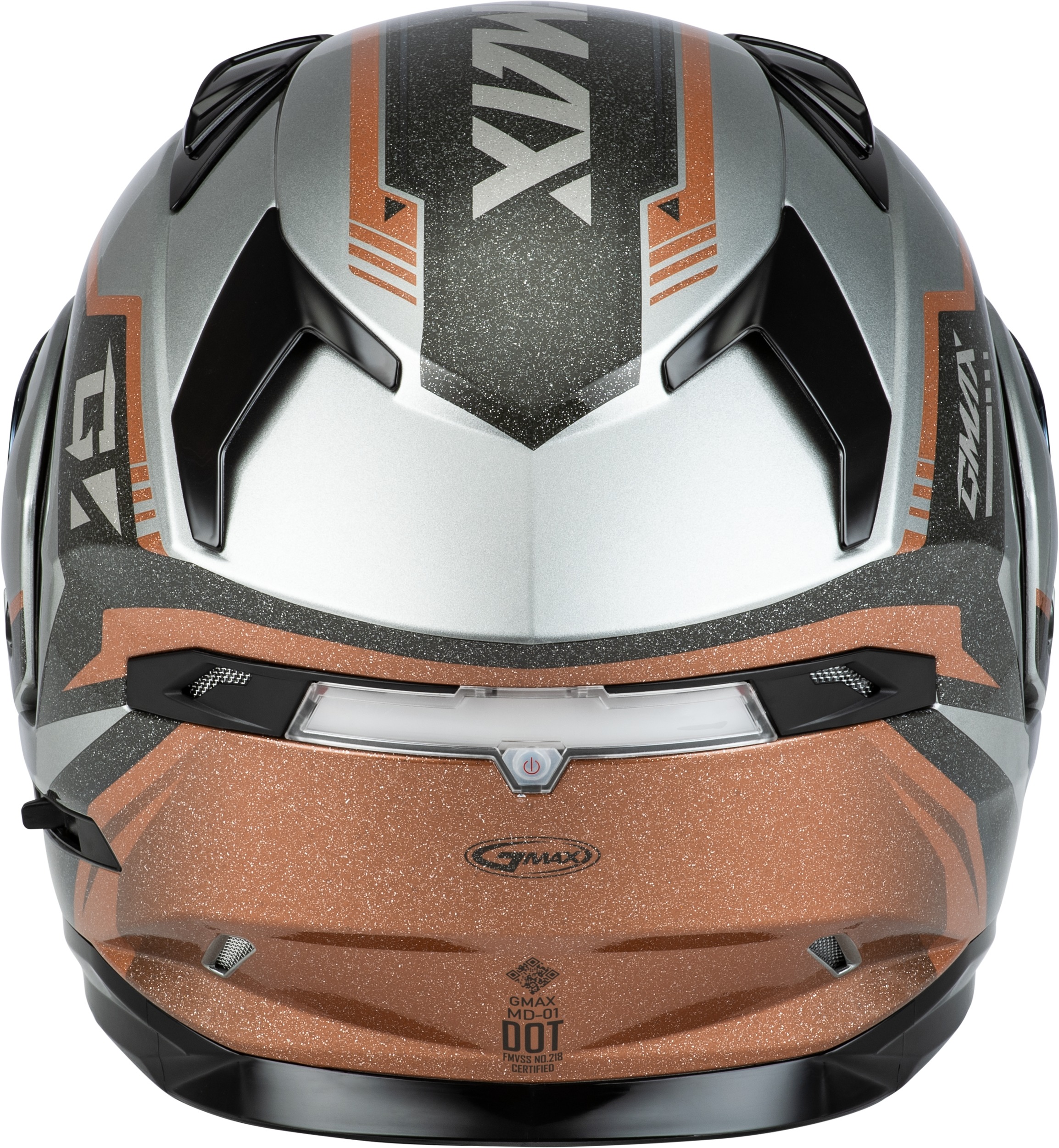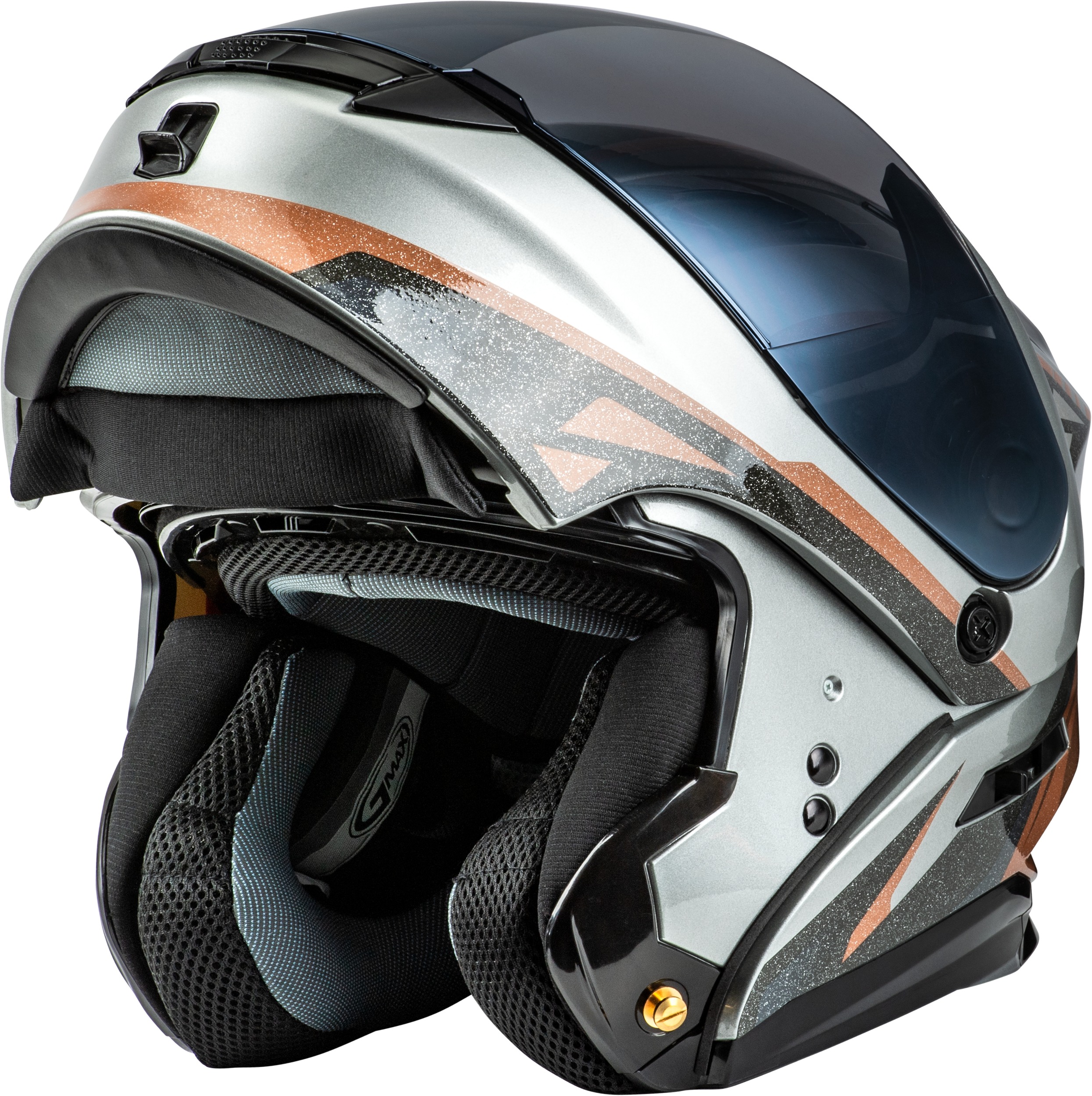 The GMAX MD-01 Volta Modular Helmet is designed for cross-country street riders seeking comfort and safety. This helmet in Grey/Black/Copper Metallic (size 3X-Large) features a lightweight Poly Alloy shell and an advanced SpaSoft™ interior with COOLMAX CORE technology that wicks moisture away and dries quickly. The removable liner is washable for easy cleaning, and the drop-down sun shade has an anti-fog coating for clear vision. Eleven vents keep you cool, while the integrated multi-function LED rear light enhances your visibility on the road. DOT approved, with built-in speaker pockets and intercom compatibility for added convenience. UV400 face shield offers full protection and the chin bar mechanism is glove-friendly for easy use.