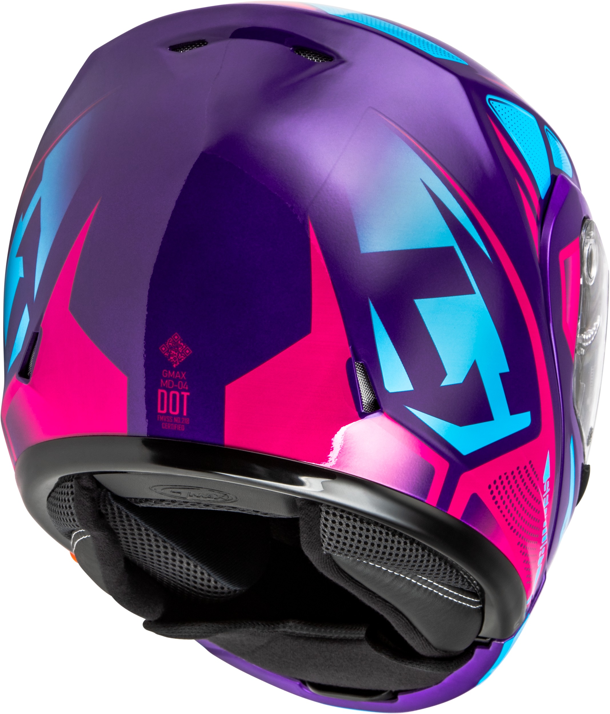The GMAX MD-04 Sector Modular Helmet in Violet/Pink is designed for riders seeking comfort, versatility, and safety on their street adventures. This lightweight helmet features a modular design with an easy-to-use chin bar and a push-to-open mechanism, perfect for use with gloves. The COOLMAX® CORE technology interior wicks away moisture to keep you dry and comfortable, and is completely removable, adjustable, and washable for easy maintenance and a custom fit. GMAX D.E.V.S (dual exhaust venting system) combined with fully closable vents helps regulate interior temperature and seals out the cold when needed. The helmet’s face shield offers 100% UV400 protection and is hard coated for superior scratch resistance. DOT approved and intercom compatible, the MD-04 Sector delivers premium features at an affordable price.