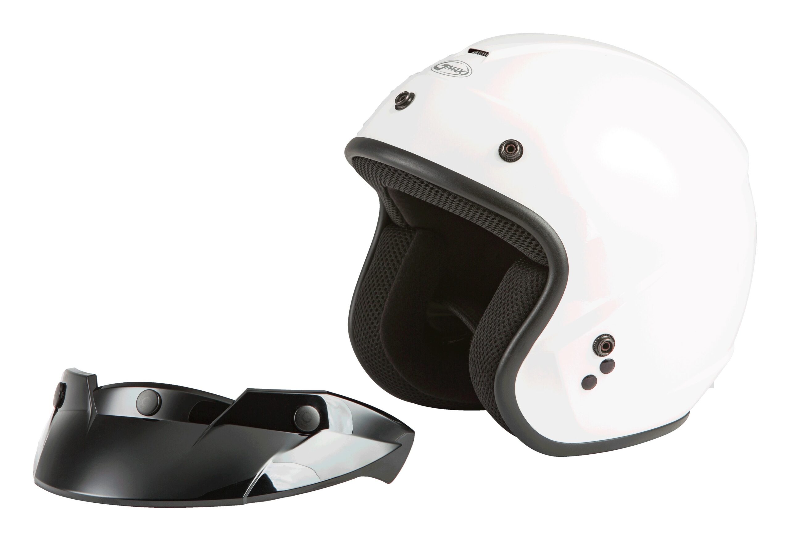 The GMAX OF-2 Open-Face Helmet in white (size small) delivers classic 3/4 helmet styling with modern comfort and versatility. Featuring a removable, adjustable, and washable COOLMAX® interior, this helmet ensures a custom fit and easy cleaning. The five-snap design accommodates a range of shields and visors for added personalization. DOT approved for safety, the OF-2 is ideal for street riders seeking an affordable, comfortable, and adaptable helmet. Optional flip-up and bubble shields are available for enhanced protection and style.