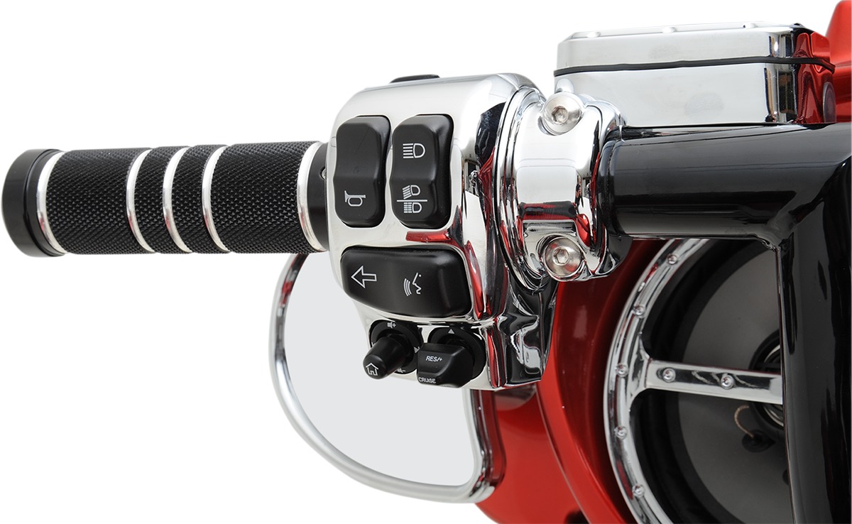 Chrome handlebar control kit with a 9/16″ bore and integrated switches. Designed for 1996-2006 models, these controls feature hidden mounting hardware on the switch housings and smooth mounting clamps for a clean look. Components are not interchangeable with OEM controls. Fits most models except Touring models equipped with radio or cruise control.