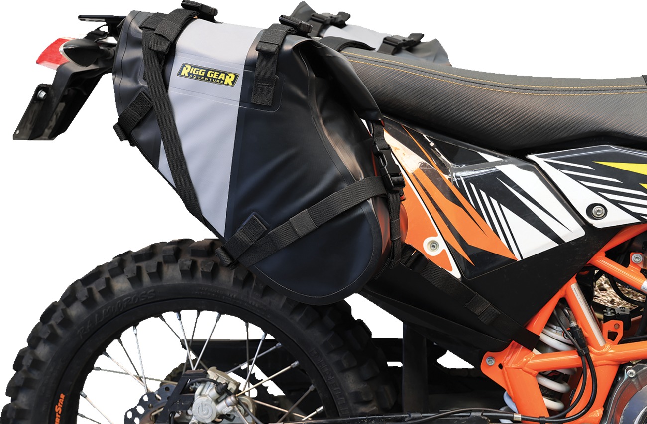 The Hurricane Dual Sport Saddlebags are a durable and versatile storage solution designed specifically for off-road motorcycles. Key features include a waterproof roll-top closure with quick-release buckles to keep your gear dry and secure. Constructed from heavy-duty UV-treated PVC tarpaulin material with electronically heat-welded seams, these bags are built to withstand tough conditions. The throw-over design eliminates the need for a rack, making them compatible with most off-road motorcycles. Secure mounting is achieved with hook-and-loop straps and tension buckles. Quick-release buckles on the top and bottom allow for additional gear attachment. Each bag includes a removable stiffener to help maintain its shape when empty and a firm internal back panel for added support. A replaceable back pad protects the bags from contact with the motorcycle’s fender. Additional features include an air purge valve for easy compression and storage optimization. The main compartment measures 17″ L x 7″ W x 9″ H, with a capacity of approximately 14 liters per side. Backed by a manufacturer’s lifetime warranty, these saddlebags are a reliable and practical choice for adventure riders.