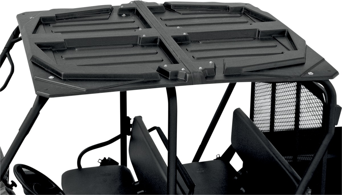 Upgrade your UTV with the Moose Offroad Two-Piece Roof in black, designed for select Kawasaki Mule and Polaris Ranger models. Constructed from durable polyethylene with UV stabilizers, this roof stands up to harsh weather, including extreme cold. Features include a molded-in cargo tray for additional storage and molded-in drains to allow water runoff. Not compatible with all windshields and must be removed for trailering. All mounting hardware included. Made in the USA.