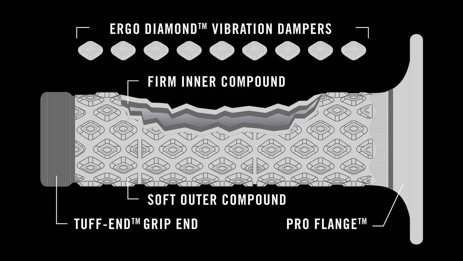 Renthal Soft/Firm MX Dual Compound Grips feature a combination of a soft outer compound for comfort and a firm inner compound for durability. The Ergo Diamond™ vibration dampers enhance grip comfort, while the Pro flange reduces inboard thumb abrasion. The Tuff-end™ grip end ensures longevity, making these grips ideal for motocross riders seeking performance and comfort.