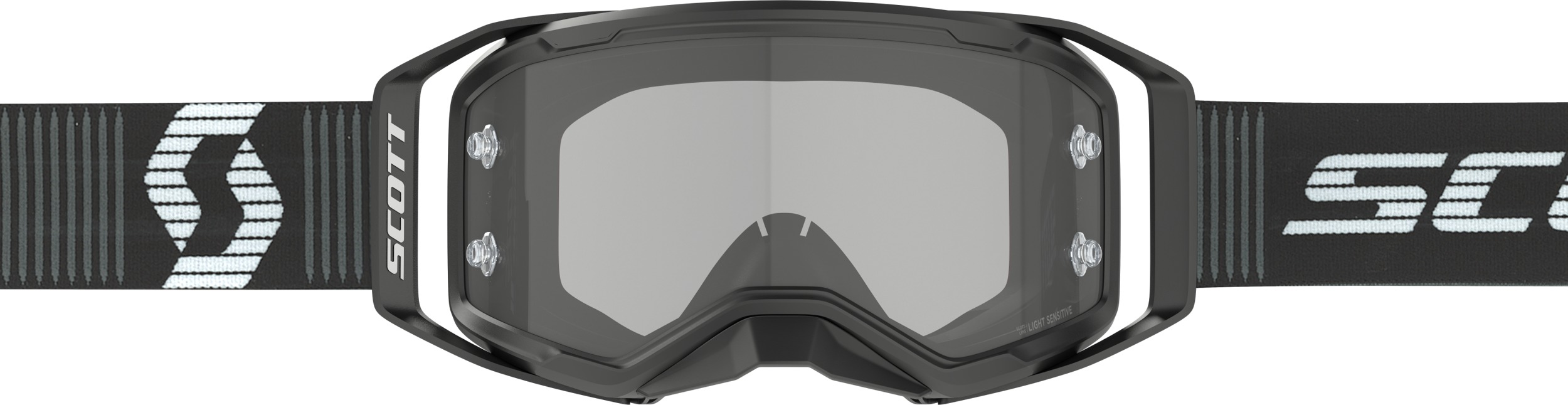 Experience premium vision and comfort with the SCOTT Prospect 2.0 LS Goggle in Black/White, featuring a photochromatic Light Sensitive Gray Works lens that adapts automatically to changing sunlight intensity. The Quick Lens Release System enables fast lens changes without sacrificing the secure fit of the Lens Lock System. Engineered for motocross and offroad performance, this goggle offers a wide field of view, NoSweat 3-layer molded face foam, articulated outriggers, and an extra wide no-slip silicone strap. The lens is impact resistant, provides 100% UV protection, and is treated with NoFog™ anti-fog technology. Includes removable nose guard, microfiber goggle bag, and complies with PPE cat. II standards under EN 1938:2010. VLT 28-86%.