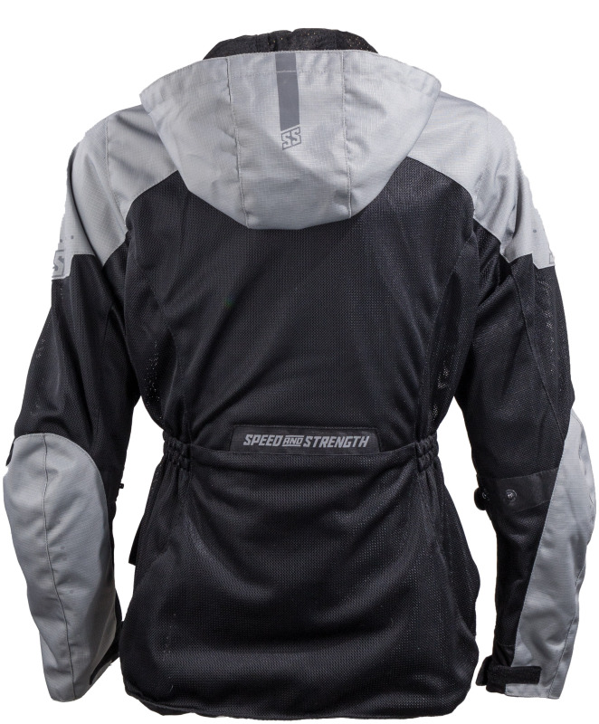 The Speed and Strength Starstruck™ Mesh Jacket for women combines Fierce™ mesh and AR-600 ripstop for a durable, breathable outer shell. This Grey/Black textile jacket includes removable Vault™ C.E. approved shoulder and elbow protectors, as well as a removable Vault™ C.E. spine protector for enhanced protection. Designed for comfort and fit, it features an elasticized ruched waist and zippered hip gussets. Ideal for warm weather riding, this Large size jacket offers both safety and style for female riders.