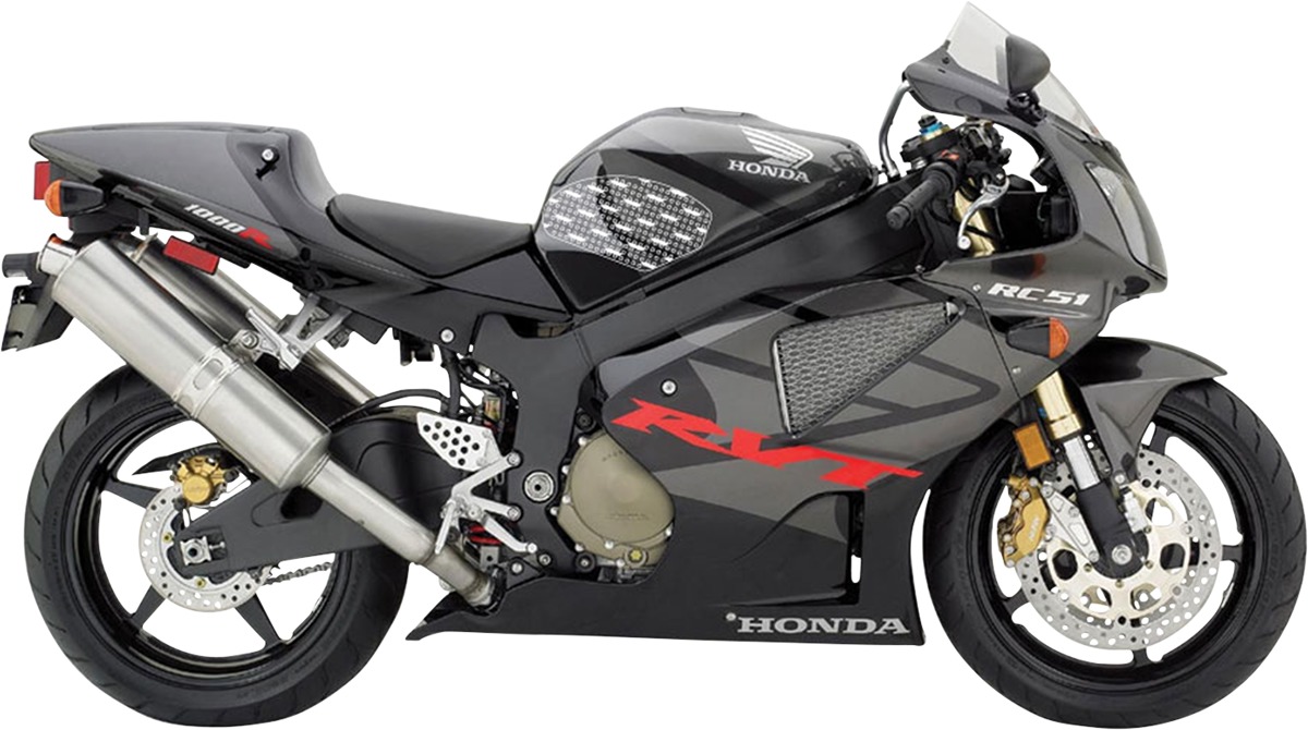 The Stompgrip Tank Protector for the 2001-2006 Honda RC51 enhances bike control by increasing grip between the rider and the motorcycle. Made from ultra-clear elastomer material, it allows paint and graphics to remain visible while providing improved lower body grip and reducing upper body stress. The non-abrasive surface is designed to wear down over time like a tire rather than damaging riding gear. It features pre-molded rounded edges to resist peeling and uses a strong 3M™ peel-and-stick adhesive for secure attachment.