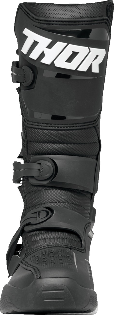 The Thor Blitz XR Boots are designed for off-road riders seeking durability and comfort. Features include a padded mesh interior for breathability, an injection-molded medial abrasion plate with integrated shift protection, and fully synthetic calf overlays for durability and optimal grip. The injection-molded outsole with a steel shank insert provides superior support. Three fully adjustable straps ensure a custom fit, while the pre-curved injection-molded shin plate enhances protection. Certified to EN 13634:2017 safety standards. Equipped with injection-molded positive lock buckles for a secure fit.