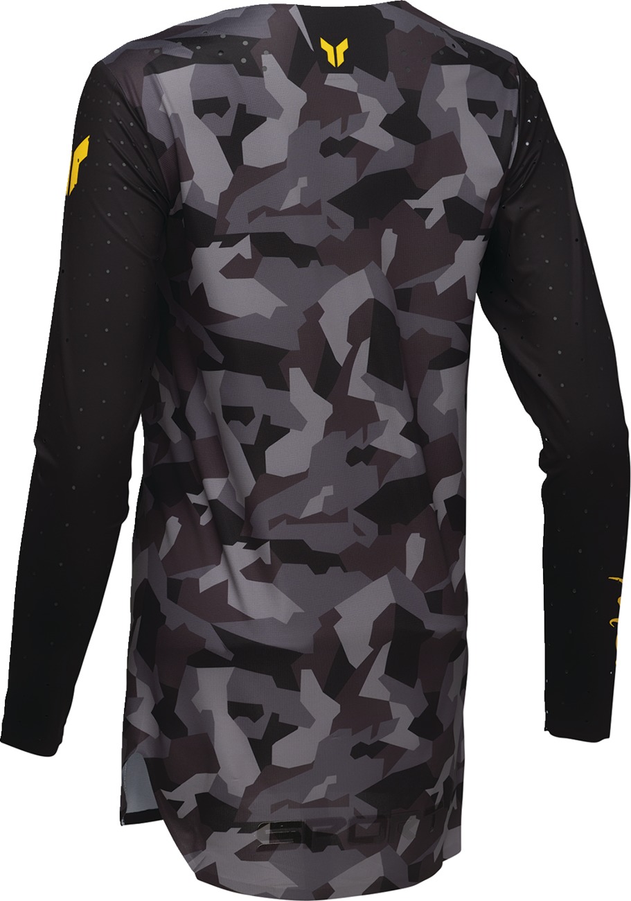 The Thor Women's SPORTMODE Shadow Jersey in Black, Yellow, and Camo Gray delivers a minimalistic, athletic fit for off-road riding. This jersey features a 4-way stretch Poly/Spandex chassis for unrestricted mobility and body contouring. Tailored set-in sleeves and a minimal seam design maximize comfort and durability, while laser-cut perforation vents enhance airflow. Taped collar, cuff, and hem seams help reduce weight and skin irritation. Moisture-wicking material properties keep you cool and dry, and the sticky silicone printed drop tail keeps the jersey in place during intense activity. Designed for women seeking high-performance racewear that combines lightweight comfort and superior stretch.
