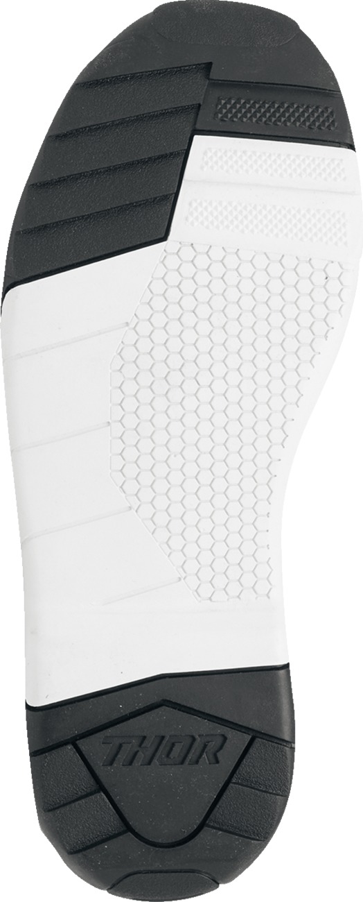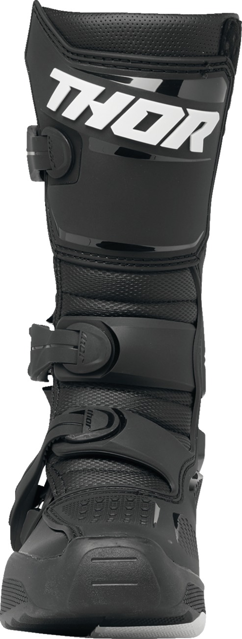 The Thor Youth Blitz XR Boots are designed for young off-road riders, providing both protection and comfort. These boots feature a pre-curved injection-molded shin plate for impact resistance, fully synthetic calf overlays for durability and grip, and an injection-molded medial abrasion plate with integrated shift protection. The uni-directional outsole includes a steel shank insert for added support, while the metal toe cap reinforces outsole strength. Four fully adjustable straps ensure a custom fit, and injection-molded positive lock buckles provide security. A mesh liner promotes airflow for breathability. Certified according to EN 13634:2017 safety standards, these boots offer top-tier protection for young riders.