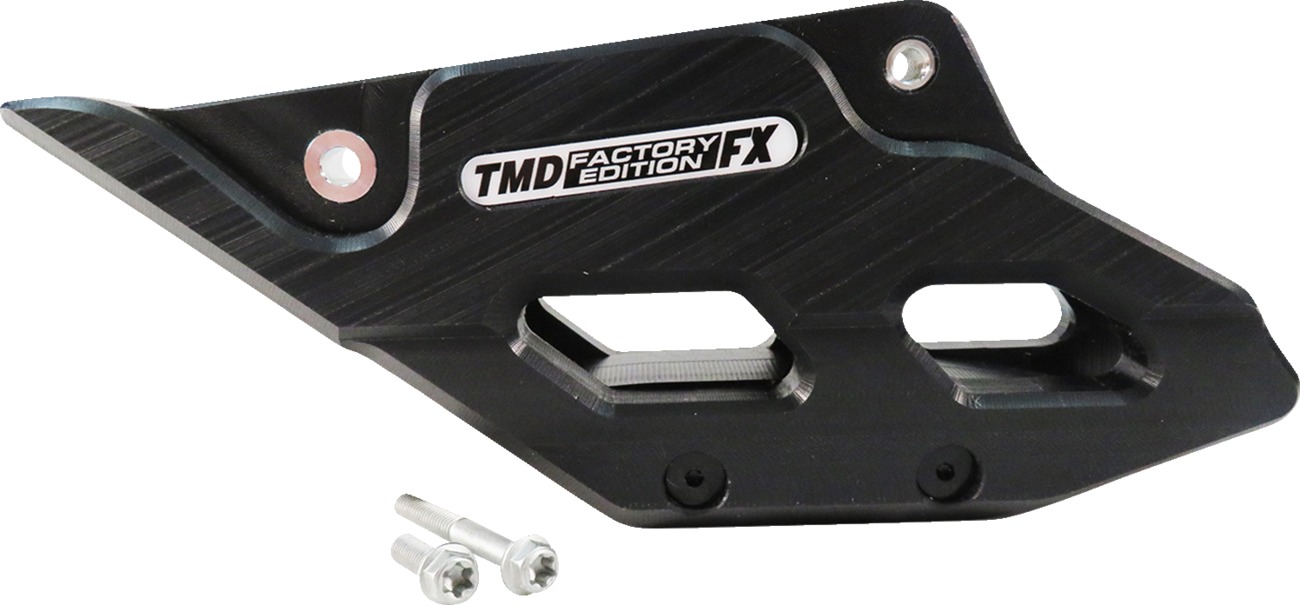 The TM Designworks Factory Edition Chain Guide with Replacement Wear Pad in black is engineered for ultimate durability and performance. Developed for hard enduro, Baja, motocross, and off-road riding, this guide features a streamlined lower profile, reinforced mounting tabs, and a large chamfered edge for maximum rock deflection. The replaceable wear pad is built for high-abrasion conditions like mud, sand, and use with oversized sprockets. Redesigned mounting bolts offer deeper recesses to reduce snagging and increase clamping strength, while small diameter pins enhance ground clearance. Constructed from TM Designworks’ industry-leading plastic formula with Return Memory System (“RMS”), it absorbs impact and returns to shape, with UV protection to eliminate color fade. Fits standard and sealed chains and includes new mounting hardware. Recommended by MXA, Dirt Bike, and Dirt Rider magazines, and used by championship-winning teams. Made in the USA.