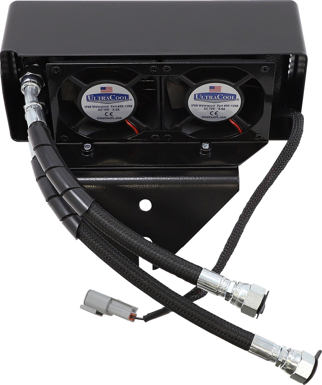 Upgrade your Harley-Davidson® M8 Touring or Trike with the UltraCool™ Side Mount Oil Cooler Kit in gloss black. This complete kit is engineered to keep your engine running cooler, featuring a specially designed dual-pass aluminum heat exchanger with turbulators for optimal heat dissipation. Dual IP68 waterproof fans produce 220 CFM of airflow, automatically activated by a thermal switch at 210°F to maintain optimal oil temperature. The kit includes black nylon-coated stainless braided AN6 oil lines, plug-and-play wiring harness with waterproof connectors, an LED indicator for fan operation, a custom oil line fitting wrench, and detailed installation instructions. Mounts on the down tube, just below the engine guard (will not fit with chopped or similar guards or models with lower fairings). Drop your oil temperature by up to 50°F for improved engine performance and longevity.