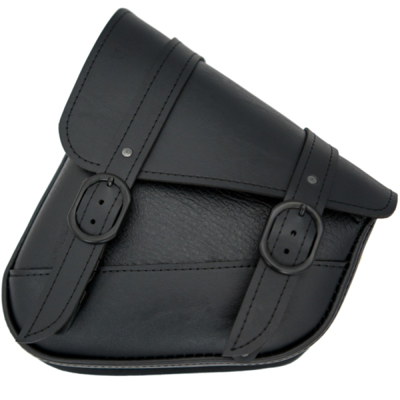 The Willie & Max Blackjack Swingarm Bag is designed for the left side of motorcycles with a triangulated swingarm, including select Harley-Davidson® Softail, Yamaha V Star, Kawasaki Vulcan, and Suzuki Boulevard models. Constructed from high-quality synthetic black leather, this rugged bag features a black buckle, magnetic closure for added security, and a rigid plastic back for shape retention. Three sturdy mounting straps slide into mounting slots for an easy, secure installation. Includes a protective film to prevent scratches on your swingarm or frame. Dimensions are approximately 10.5" L x 4.5" W x 11.5" H. Not compatible with passenger floorboards or footpegs.