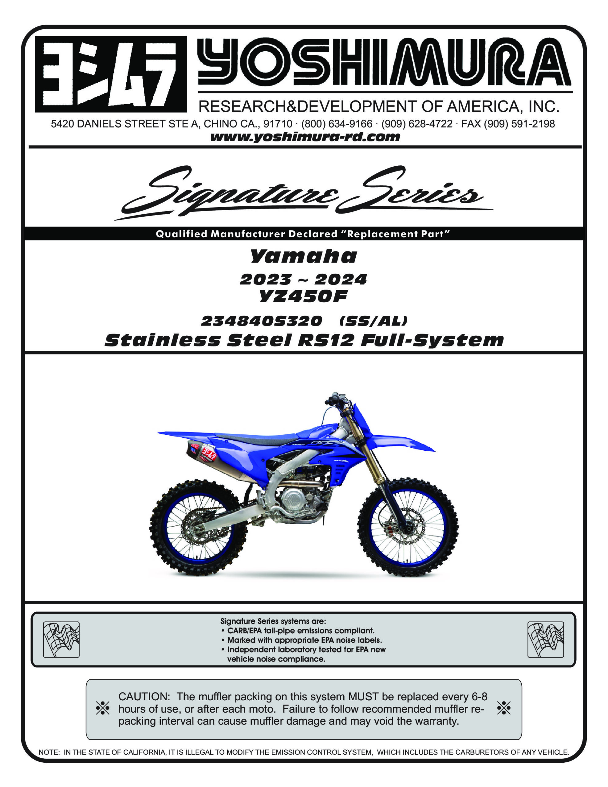 The Yoshimura RS-12 Signature Series Full Exhaust System is the result of over three years of development and testing. Designed in collaboration with factory-sponsored athletes and expert engineers, the RS-12 features an aggressive, asymmetrical shape to maximize muffler volume, manage sound, and increase power while improving clearance. Key elements include a works-look matte carbon fiber end cap with intricate decal inlays, precision-machined joints, and a patent-pending Precision Taper Fit (PTF) insert ring. The RS-12 system is engineered to perform and built to last, making it a top-tier choice for serious riders.