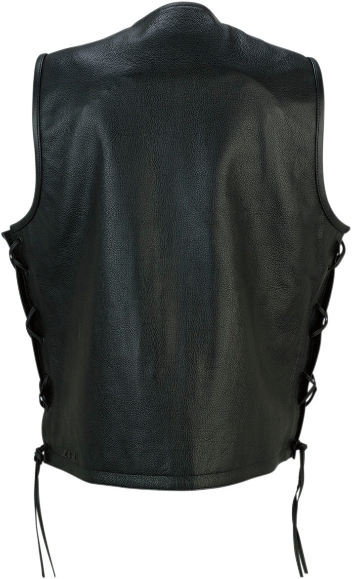 The Z1R Gaucho Vest in black (XL) is crafted from premium 1.1-1.2mm full grain cowhide leather, offering durability and classic style. Featuring a one-piece seamless leather back panel with zipper access for easy embroidery or patch application, this vest is designed for customization. Adjustable leather drawstrings along the sides provide a custom fit, while a snap front closure ensures secure wear. Functional storage includes two interior concealed carry pockets, two hand warmer pockets, and two chest pockets. The polyester inner liner is moisture wicking, keeping you comfortable on and off the bike.