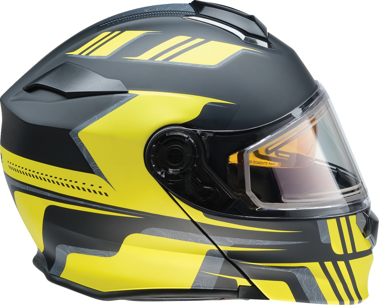 The Z1R Solaris First Tracks Modular Snow Electric Helmet is designed for optimal comfort and visibility in cold weather conditions. Featuring an injection-molded polycarbonate shell, this helmet includes a dual-pane anti-fog electric shield and a standard shield for versatile use. The micrometric helmet strap ensures a secure fit, while the amber drop-down sun visor is easily activated with a side lever. Closable chin and top vents, along with a rear exhaust vent, provide excellent airflow. The fully removable polyester moisture-wicking liner and cheek pads enhance comfort, and the removable breath box and chin curtain help to reduce fogging. Meets DOT FMVSS-218 safety standards.