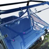 The 2013 Polaris Ranger Crew 800 Windbreak Folding Windshield is crafted from premium 0.177″ thick, optically clear polycarbonate material. It features a folding design that can be adjusted up or down to control airflow in the cabin. Installation is tool-free, utilizing Velcro straps to attach to the roll cage. An included upper filler panel eliminates gaps between the cage and the windshield. Partial assembly is required.