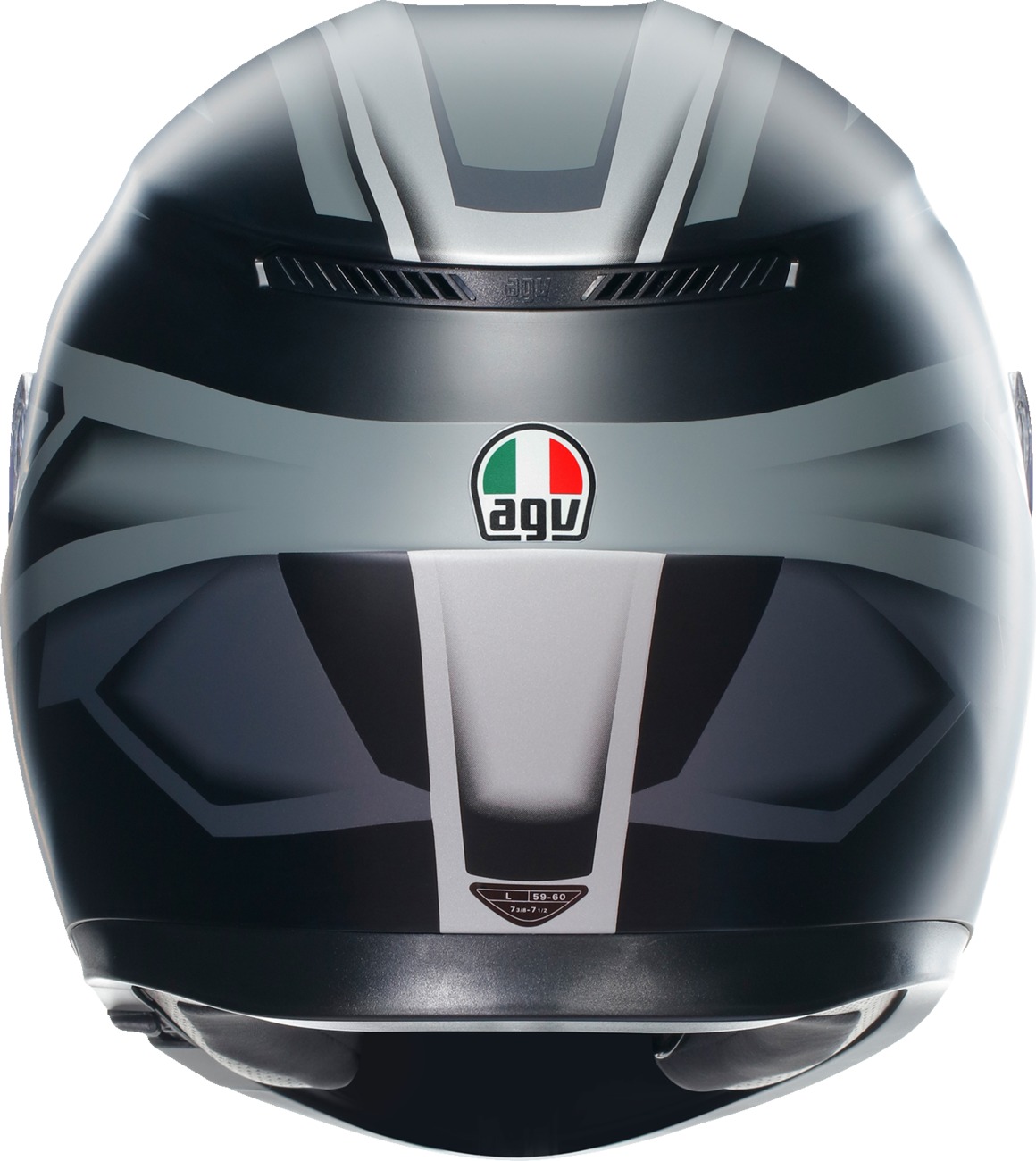 The AGV K3 Compound Full Face Helmet delivers premium protection and comfort for motorcycle riders. Constructed from high-resistance thermoplastic resin, it features a collarbone-safe profile, optimized aerodynamics, and a shell shape designed for stability at high speeds. Four front vents and a rear extractor ensure efficient airflow, while the 2Dry liner quickly absorbs sweat and provides a snug, glasses-friendly fit. Removable and washable interiors enhance hygiene. The helmet comes with a 100% Max Vision Pinlock® lens and wind protector, an integrated anti-scratch sun visor (removable without tools), and a micro-opening multistep visor mechanism. Certified to DOT and ECE 22.06 standards. Other features include a steel micrometric retention system, extra quick release visor system (XQRS), and compatibility with generic communication systems. Matte gray/black Compound graphic, size 2XL.