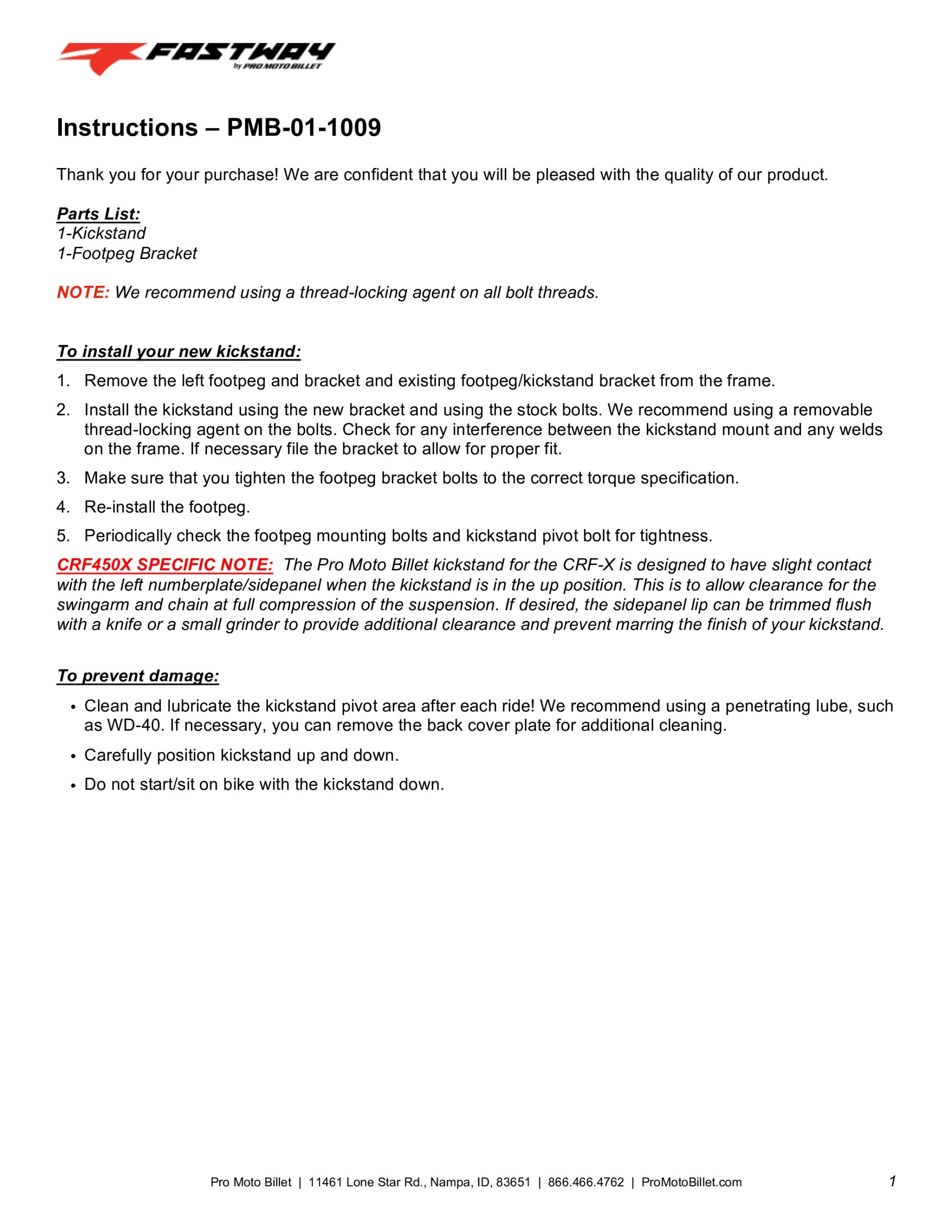 Fastway Kickstands are easy to install, provide superior strength, and offer a lightweight design. Kickstands bolt on using existing mounting locations and feature 6061 billet aluminum construction for durability and ease of maintenance. When on the trail the stand folds under the side panel. You won’t even know it’s there!