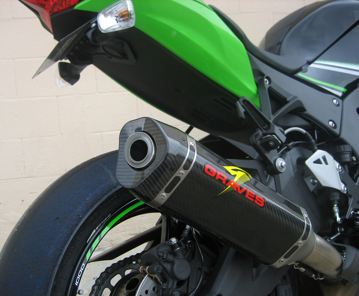 Graves Motorsports Kawasaki ZX10r Cat Back Titanium Exhaust System with carbon fiber canister. GMS Exhaust systems are designed for the elite rider seeking top of the line performance, fit, finish and value. This ZX10 exhaust system was developed using the same technology that has powered Monster Energy Graves Yamaha riders to 6 straight consecutive Superbike championships and numerous 600 titles. This system does not require the removal of any standard emissions equipment. This product is intended for closed course competiton use only. New Carbon Can Design Featuring: Carbon Fiber Sleeve with Carbon Fiber End Cap and aerospace grade titanium exhaust tubing. Strapless can design mounts without the use of strap bands around the can using a tap mounted bracket that’s integrated into the can. This design not only streamlines looks of your bike and saves weight. Features: Stock Can + Cat System Weight = 4.6 lbs. : Cat Eliminator System Weight = 4.0 bs. (.6 lb. savings) w/ Insert (sold seperately) 76 DB @ Idle / 89 DB @ 5000rpm / without insert.: 79 DB @ Idle / 91 DB @ 5000rpm ( Completely Stock DB @ idle 79 DB @ 5000 90.5 ) Fitment: Kawasaki ZX10r 2016-2017