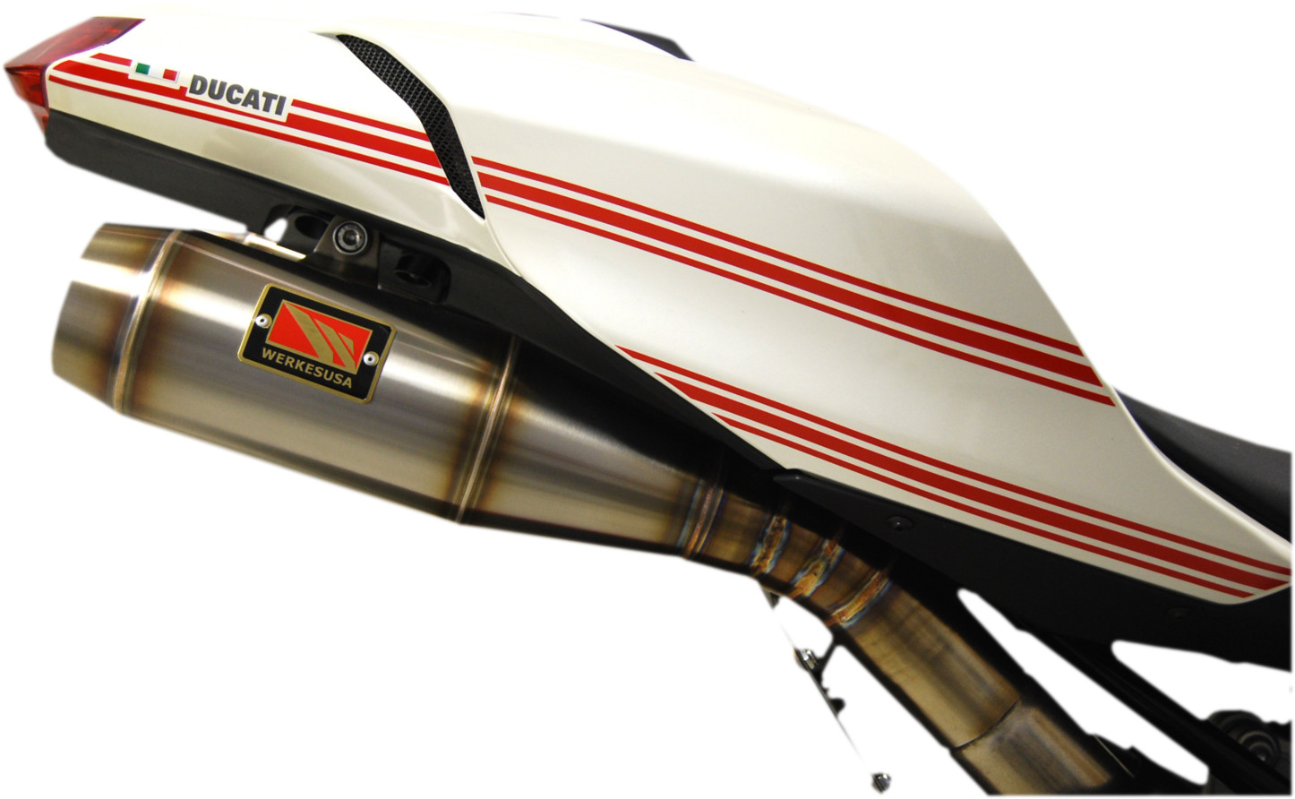 This Competition Werkes GP exhaust is handmade from straight and conical section stainless steel. The fine craftsmanship and attention to detail isn’t the only thing you’ll get with this exhaust. The prototype race look will add a touch of ‘factory prepared’ looks to your street machine. This pipe is baffled, but only enough to keep it ‘streetable’, you’ll still get the Competition Werkes race sound and power.