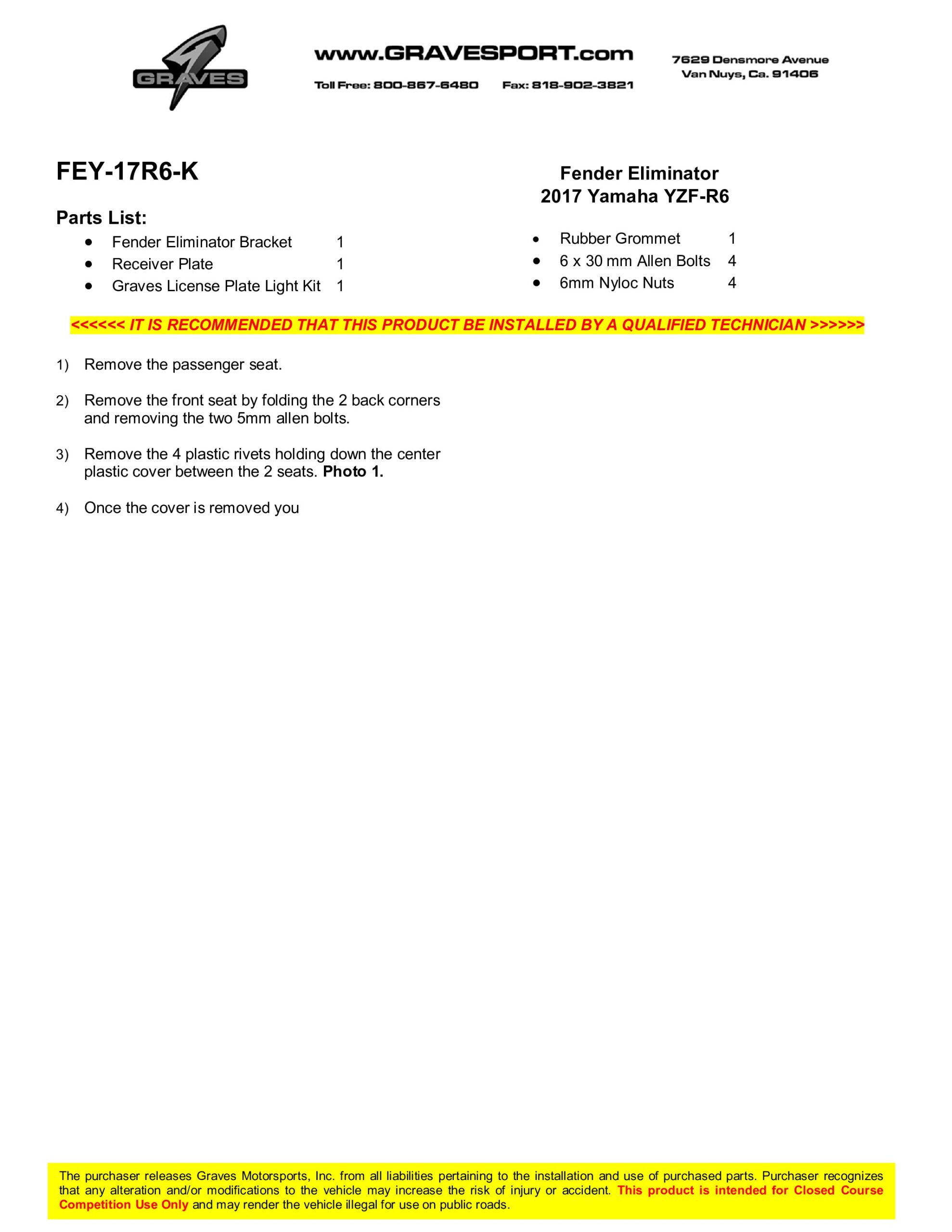 Graves Motorsports Fender Eliminators for the all new R6 are designed to eliminate the stock rear fender to give the bike a more race inspired and streamlined look.The Graves tag kits are designed to have multiple options. Use with stock Yamaha rear turn signals, with Graves aftermarket signals (by moving the mounting position of the signal holders), or without signals at all by removing the turn signal mounts completely.All Graves Motorsports Yamaha fender eliminator kits are fabricated from black powder coated aluminum for long term reliability and great looks. There is no cutting required to your stock fender and all hardware is included for easy installation.