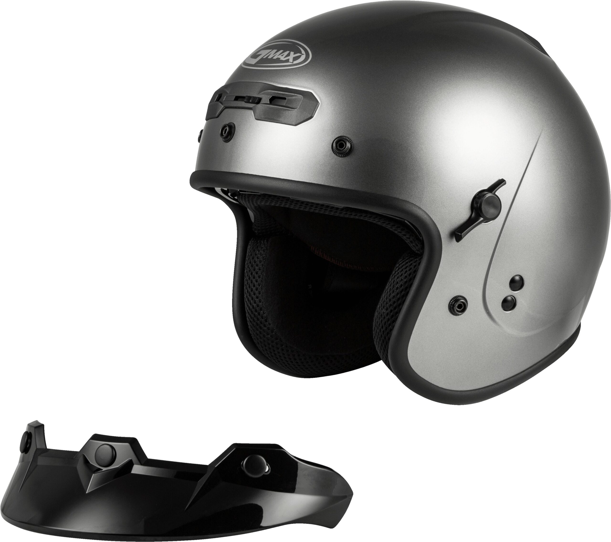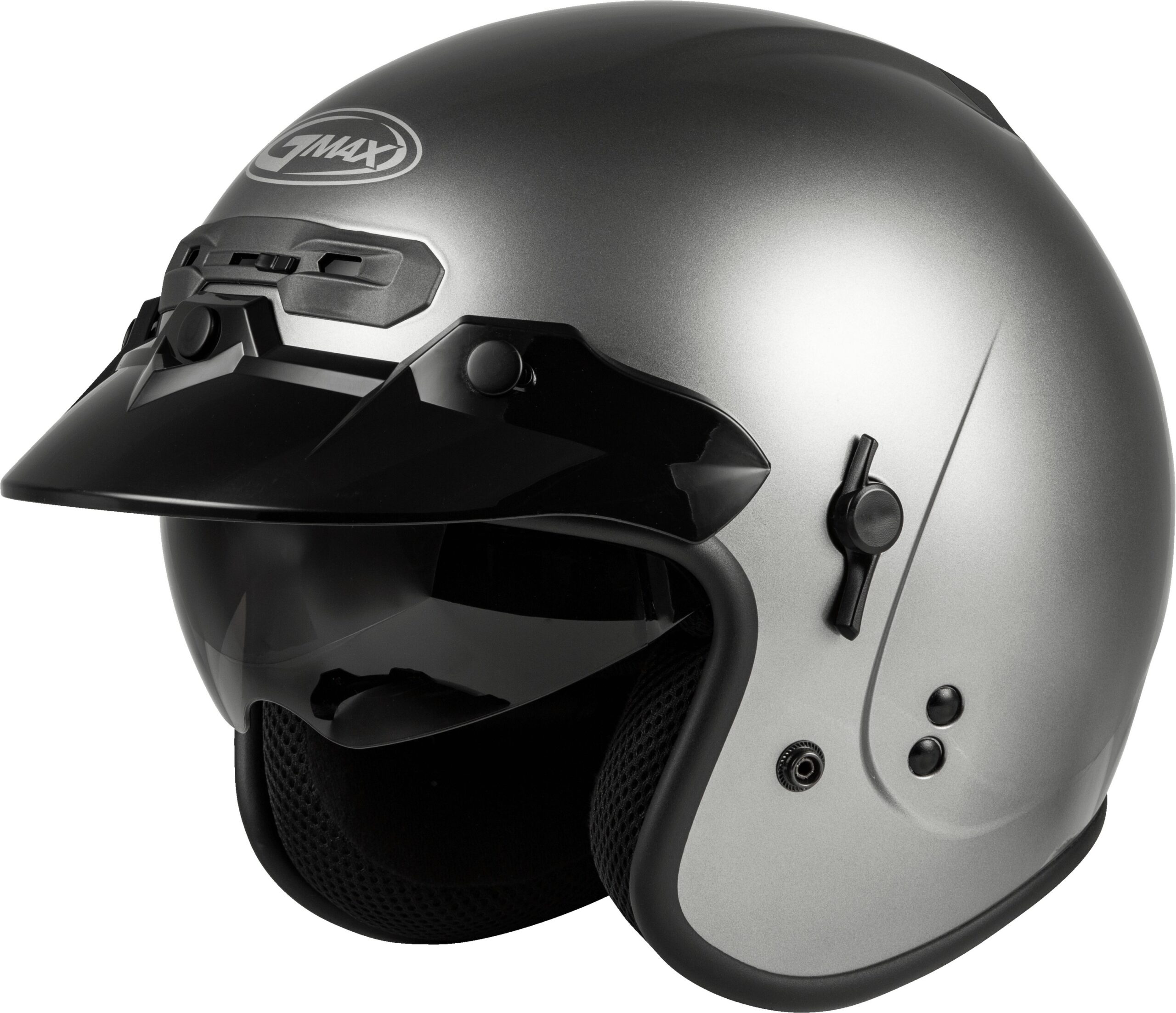 The GMAX GM-32 Open-Face Helmet in Titanium (Small) combines modern convenience and classic style. Featuring a retractable, tinted inner sun shield with 100% UV400 protection and anti-fog coating, this helmet is designed for comfort and versatility. The three-snap removable visor system and COOLMAX® interior liner provide easy customization and cleaning. It is DOT approved, includes GMAX flow-through intake/exhaust venting, and is compatible with intercom systems. All vents and shields are easily operated with gloved hands, making it ideal for street riders seeking both protection and practicality.
