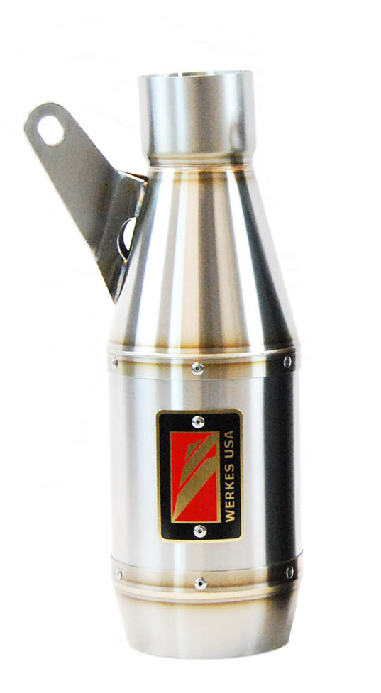 This Competition Werkes GP exhaust is handmade from straight and conical section stainless steel. The fine craftsmanship and attention to detail isn’t the only thing you’ll get with this exhaust. The prototype race look will add a touch of ‘factory prepared’ looks to your street machine. This pipe is baffled, but only enough to keep it ‘streetable’, you’ll still get the Competition Werkes race sound and power.