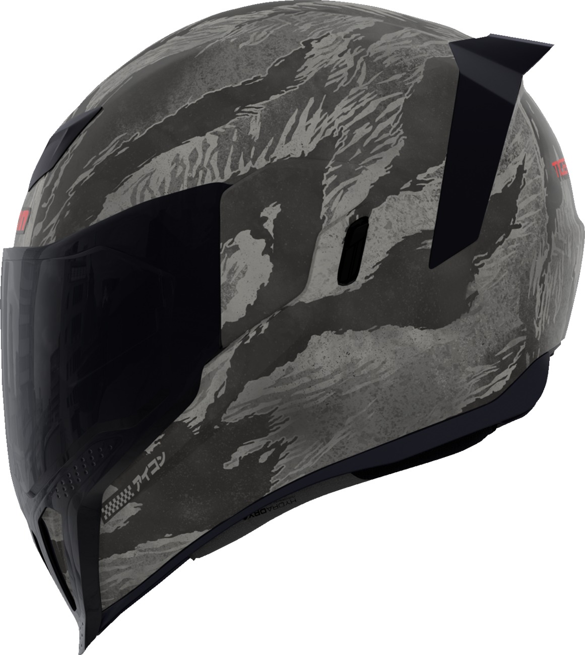 The ICON Airflite Tiger’s Blood MIPS Helmet features an injection-molded polycarbonate shell for superior strength. It boasts multiple oversized intake and exhaust ports for ventilation, a Fog-Free Dropshield™ with an exterior switch, and a quick-change Fog-Free Fliteshield™ with side plates. The removable molded breath deflector and chin curtain enhance comfort, while the recessed twin-channel supervent cooling system ensures airflow. Internal speaker pockets are designed to work with ICON’s R.A.U. Bluetooth device. The Hydradry™ moisture-wicking liner is fully removable and washable. Includes a clear Fliteshield™, dark smoke Forceshield™, and a dark smoke Dropshield™. Meets ECE 22.06 and DOT FMVSS-218 safety standards.