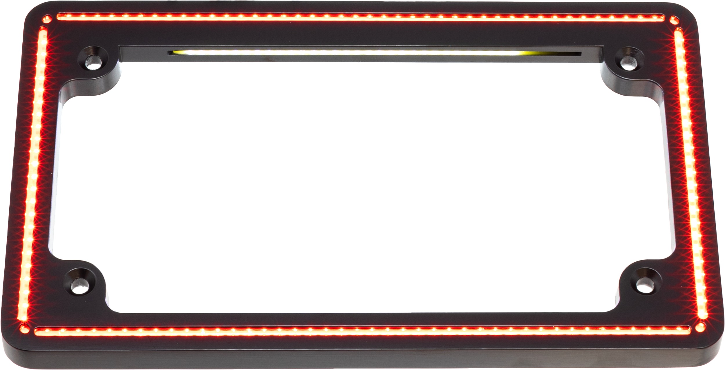 Finish: gloss black. Universal fit for standard 4" x 7" plates. Harness and lighting are built into the frame for a clean, minimal setup.
