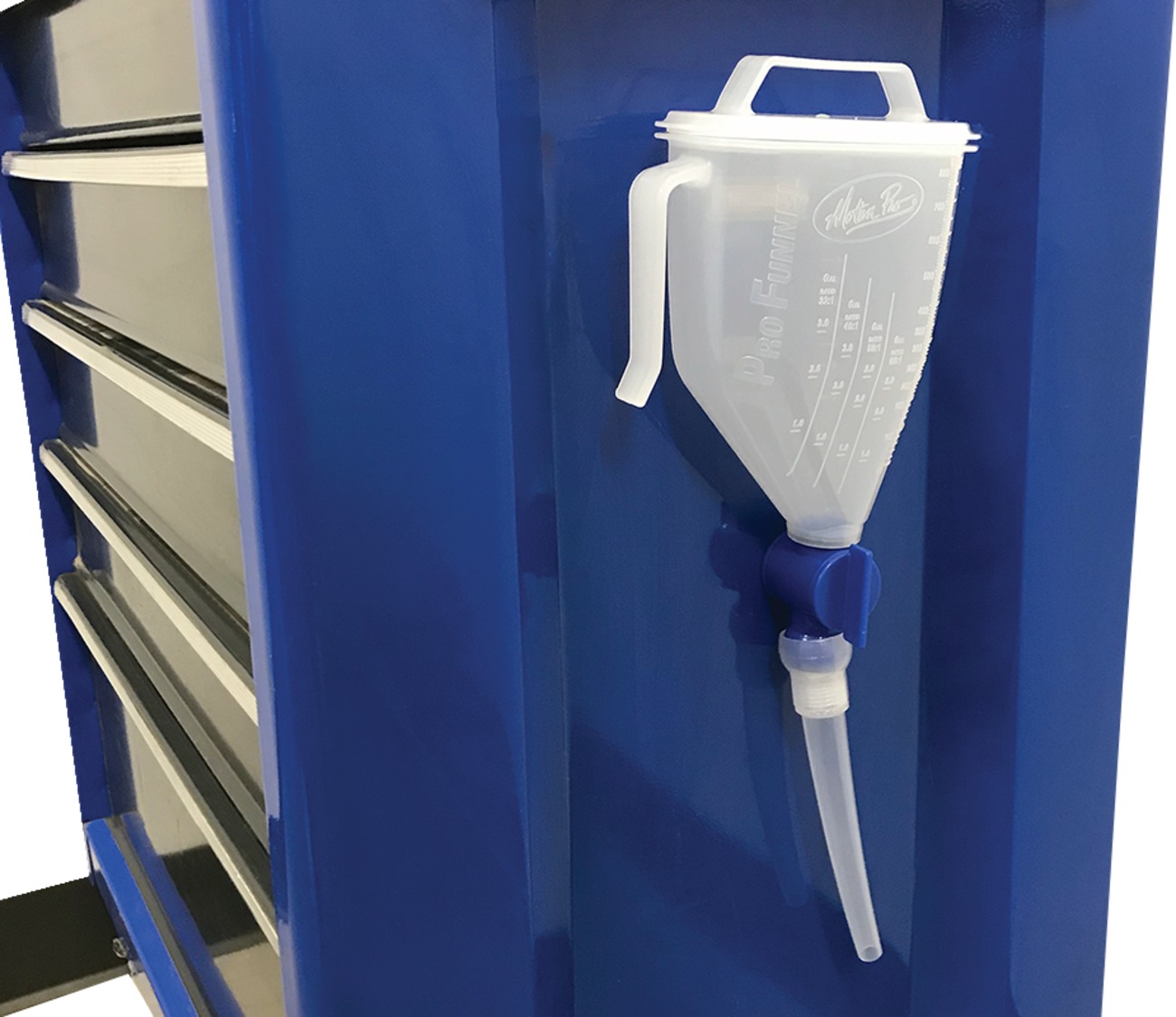 The Motion Pro ProFunnel is a versatile measuring and dispensing funnel designed for precision and convenience. It features an integrated shutoff valve that allows controlled liquid dispensing and has clear graduation marks for cubic centimeters, fluid ounces, and premix ratios, including 32:1, 40:1, 50:1, and 60:1 for 1 to 3 gallons. With a 1000 cc (34 oz.) capacity, it provides ample volume for mixing and transferring fluids. The adjustable ball-pivot spout ensures easy, spill-free pouring, while the reduced neck design helps prevent drips when the funnel is laid on its side. A large molded handle offers a secure grip, and the top cover keeps dust and debris out when not in use. Additionally, a built-in magnet allows for convenient storage on the side of a toolbox. Made from durable HDPE plastic, the ProFunnel is a practical tool for precise fluid handling.