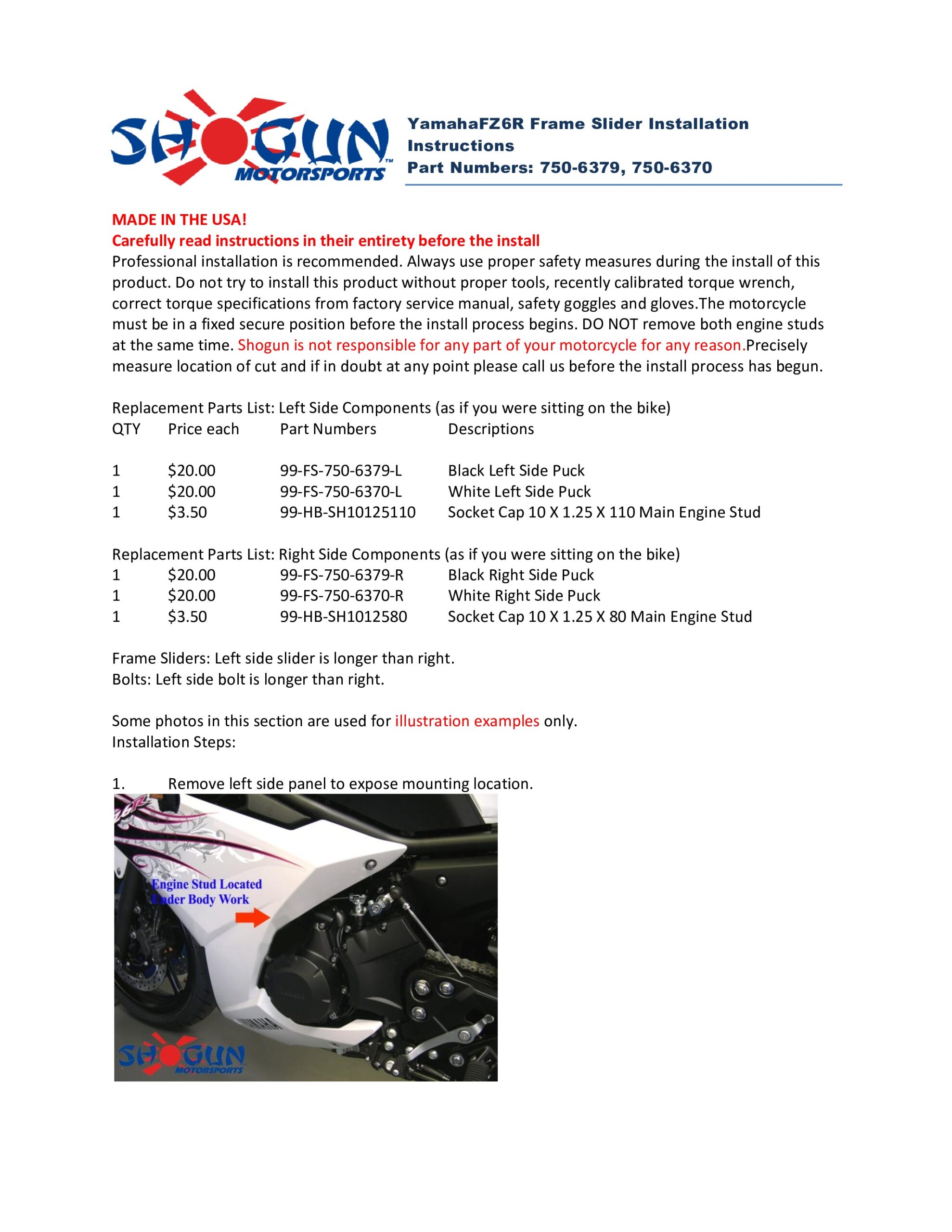 Shogun frame sliders are superior to other frame slider brands by virtue of their construction and material. Shogun pucks are made of shatter-proof UHMW infused with UV protective polymer. Shogun pucks absorb kinetic energy from crashes and will not shatter in cold temperature like some types of Delrin or fade in the sun. Each puck has a press fit aluminum bushing to hold it in place during impact to reduce the risk of the puck tearing off of the mounting point. Shogun frame slider offsets are CNC machined from the same grade aluminum as military aircraft. Offsets are anodized black to match OEM components. Each offset is manufactured to stringent specifications with ISO 9000 quality control. Each Shogun Frame Slider comes with high tensile strength corrosion resistant hardware (cheap imitators do not use high grade hardware and will quickly rust). Shogun uses socket head bolts in nearly every kit, allowing for stronger frame slider design in a more compact space. Newer applications of Shogun Frame Sliders make use of a counter sunk design, which distributes the force of impact over a wider area and gives additional strength to the system so that the puck remains attached to the motorcycle.