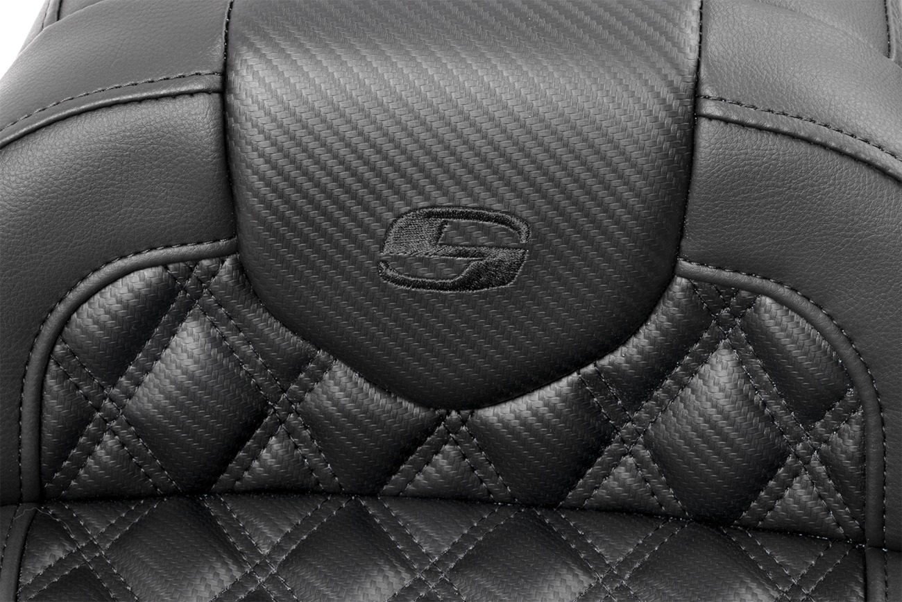 The Saddlemen Roadsofa™ Lattice Stitch Seat is engineered for exceptional comfort and style. Designed for Harley-Davidson® FLHX Street Glide, FLTRX Road Glide, FLTRXSTSE CVO Road Glide ST, FLHXSE CVO Street Glide, and FLTRXSE CVO Road Glide models from 2023-2024. SaddleGel™ inserts in front and rear reduce tailbone pressure and improve circulation for both rider and passenger. The tall 5-1/2" lumbar support and wide driver saddle provide superior back and leg comfort, while a streamlined nose enhances the rider’s reach to the ground. A refined split-cushion design maximizes long-range comfort by separating the seating surface from the lumbar support. Upholstered in ventilated, soft, perforated leather with carbon fiber accents and weatherproof SaddleHyde™ for a luxurious look and ride. Includes a fitted rain cover to protect your seat from water and dirt. Designed and made in the USA.
