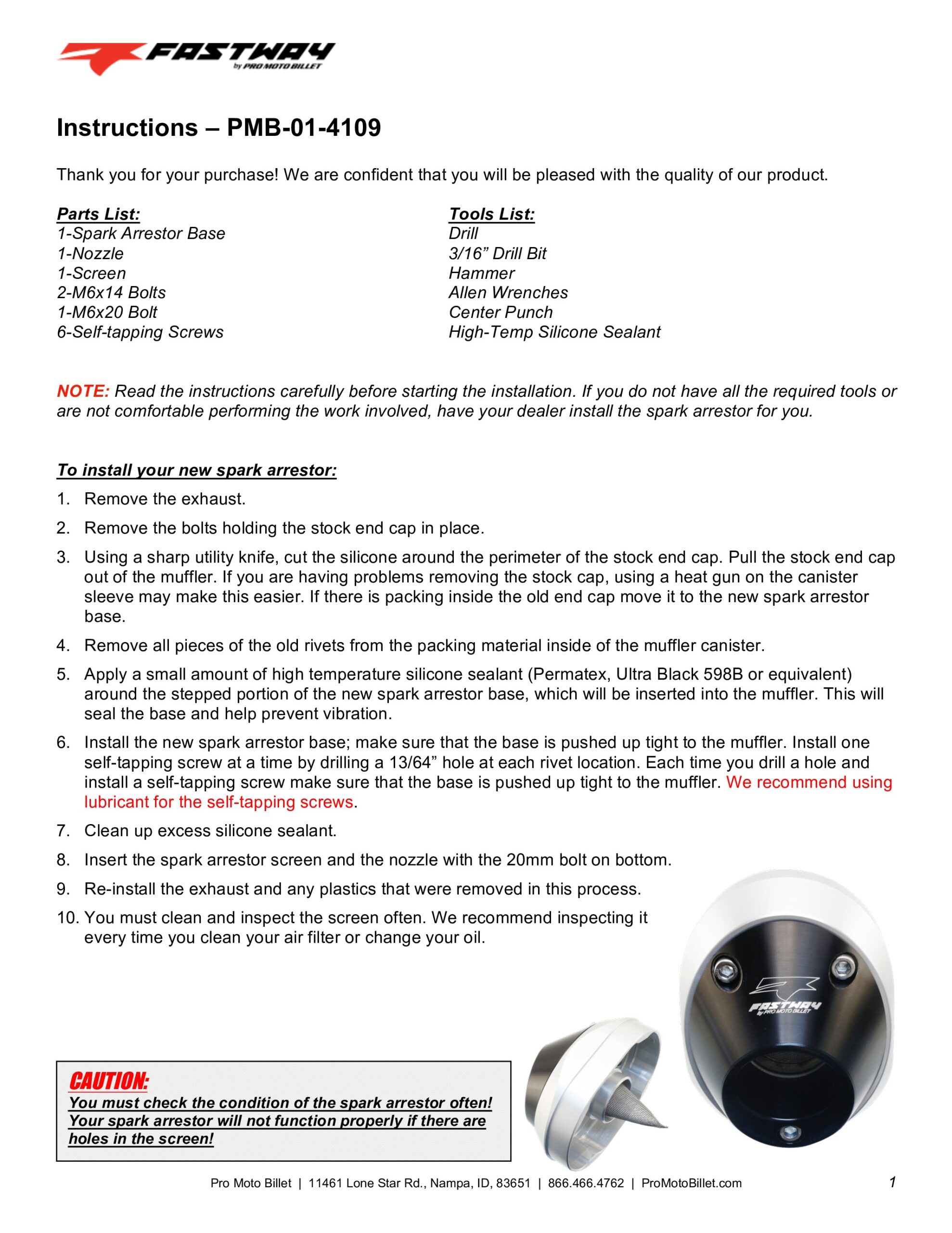 The Fastway Spark Arrestor End Cap is designed as an efficient way to convert your stock muffler into a U.S.F.S. approved spark arrested muffler. When the spark arrestor screens are not required, such as at the MX track, simply remove two machine screws on each end cap and take out the screens. Each end cap is machined out of solid 6061 aluminum and anodized with a protective finish. Designed to quickly and easily convert stock, 4-strokes and some 2-strokes, to United States Forest Service (U.S.F.S.) approved mufflers.