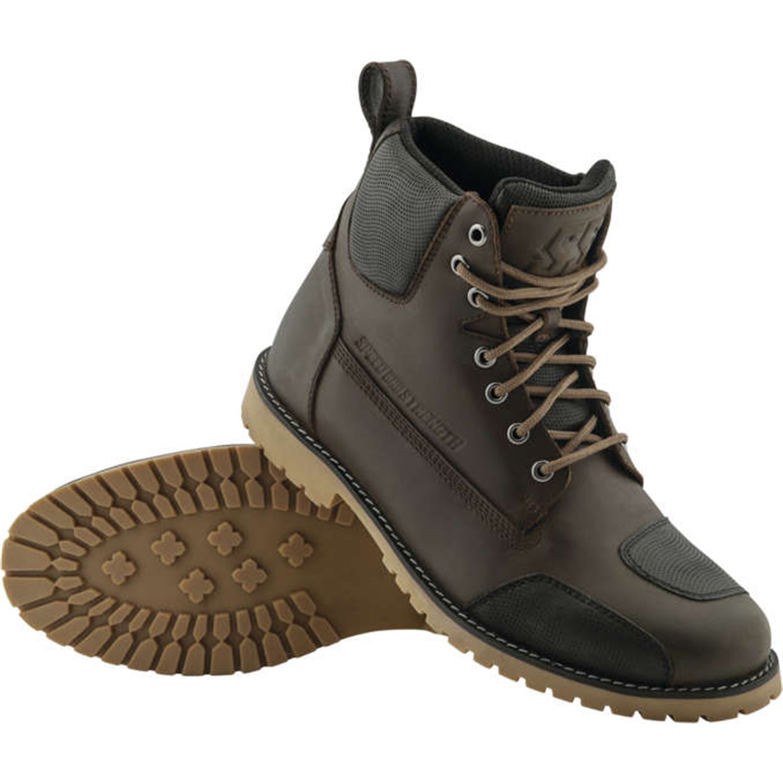The Speed and Strength Call to Arms Boot is designed for durability and protection. It features a synthetic leather upper with a breathable microfiber mesh inner liner for comfort. Reinforced ankle padding and dual-density padding at the entry provide additional support. For protection, the boot includes internal heel and toe reinforcements, as well as a reinforced toe shifter pad. The anti-slip rubber outsole ensures a secure grip, while the lace closure provides a secure fit. This boot meets C.E. EN 13634:2017 safety standards.