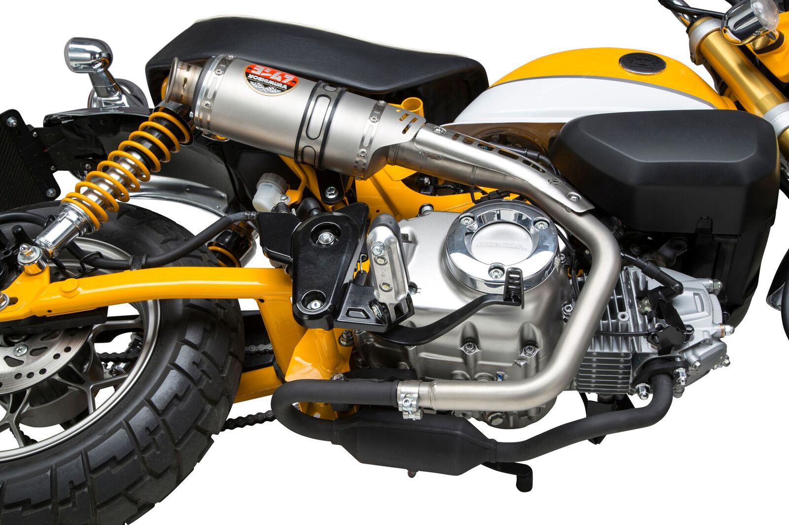 For Yoshimura, getting the details right on the Monkey was critical. Sure we added performance. Our Slip-On system max HP is up 7.2% as well as max torque being up 2.9%, but the sound had to be fitting for the new two-wheeled primate – enter the custom developed pint-sized RS-3. With a custom hard anodized cap featuring a titanium tip, a special inner core baffle, and an integrated heat shield, this little guy delivers style, performance, tone and fun! Its all about the details on this system for the Monkey!