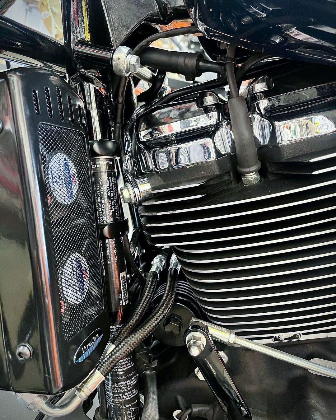 Upgrade your Harley-Davidson® M8 Touring or Trike with the UltraCool™ Side Mount Oil Cooler Kit in gloss black. This complete kit is engineered to keep your engine running cooler, featuring a specially designed dual-pass aluminum heat exchanger with turbulators for optimal heat dissipation. Dual IP68 waterproof fans produce 220 CFM of airflow, automatically activated by a thermal switch at 210°F to maintain optimal oil temperature. The kit includes black nylon-coated stainless braided AN6 oil lines, plug-and-play wiring harness with waterproof connectors, an LED indicator for fan operation, a custom oil line fitting wrench, and detailed installation instructions. Mounts on the down tube, just below the engine guard (will not fit with chopped or similar guards or models with lower fairings). Drop your oil temperature by up to 50°F for improved engine performance and longevity.