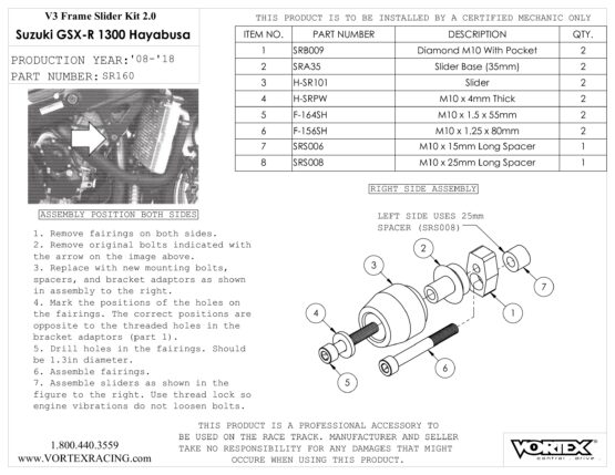 • Detailed assembly instructions are included, Vortex recommends that its V3 2.0 frame sliders be installed by a certified motorcycle mechanic