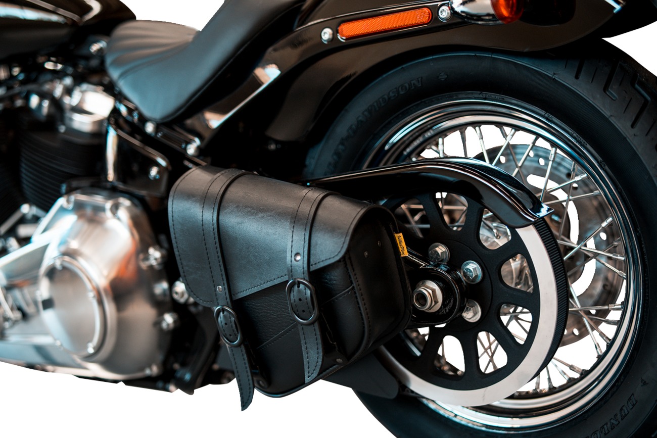 The Willie & Max Blackjack Swingarm Bag is designed for the left side of motorcycles with a triangulated swingarm, including select Harley-Davidson® Softail, Yamaha V Star, Kawasaki Vulcan, and Suzuki Boulevard models. Constructed from high-quality synthetic black leather, this rugged bag features a black buckle, magnetic closure for added security, and a rigid plastic back for shape retention. Three sturdy mounting straps slide into mounting slots for an easy, secure installation. Includes a protective film to prevent scratches on your swingarm or frame. Dimensions are approximately 10.5" L x 4.5" W x 11.5" H. Not compatible with passenger floorboards or footpegs.