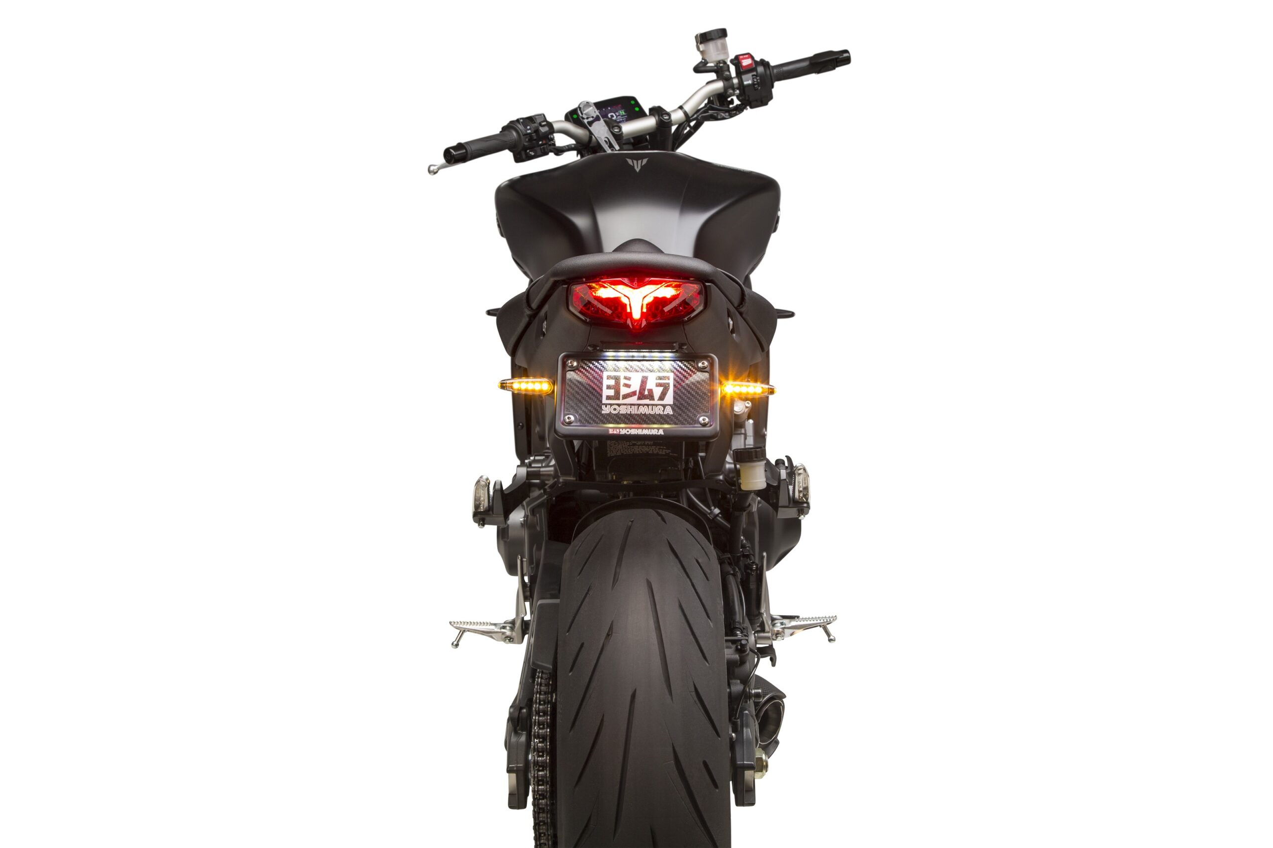 Upgrade your Yamaha MT-09 (2021-2023) with the Yoshimura Fender Eliminator Kit. Crafted with precision, this kit features a laser-cut stainless steel bracket that fits discreetly under the tail section. The black anodized CNC machined light housing includes four bright LED lights and showcases a laser-etched Yoshimura logo. Also included is a black anodized aluminum license plate frame with a silk-screened Yoshimura logo, as well as all necessary stainless steel hardware. For riders who want a sleek, race-inspired look, this kit offers both style and functionality. Compatible with aftermarket turn signals with the optional Universal turn signal bracket kit (960-9199).